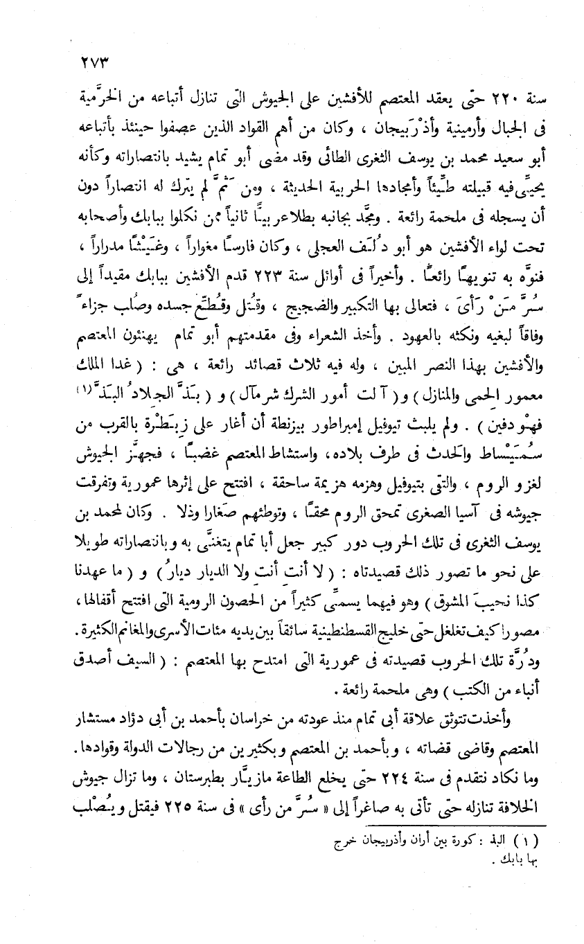 سنة 220 حتى يعقد المعتصم للأفشين على الجيوش التى تنازل أتباعه من الخرّمية فى الجبال وأرمينية وأذربيجان، وكان من أهم القواد الذين عصفوا حينئذ بأتباعه أبو سعيد محمد بن يوسف الثغرى الطائى وقد مضى أبو تمام يشيد بانتصاراته وكأنه يحيّى فيه قبيلته طيّئا وأمجادها الحربية الحديثة، ومن ثمّ لم يترك له انتصارا دون أن يسجله فى ملحمة رائعة. ومجّد بجانبه بطلا عربيّا ثانيا ممن نكلوا ببابك وأصحابه تحت لواء الأفشين هو أبو دلف العجلى، وكان فارسا مغوارا، وغيثا مدرارا، فنوّه به تنويها رائعا. وأخيرا فى أوائل سنة 223 قدم الأفشين ببابك مقيدا إلى سرّ من رأى. فتعالى بها التكبير والضجيج، وقتل وقطّع جسده وصلب جزاء وفاقا لبغيه ونكثه بالعهود. وأخذ الشعراء وفى مقدمتهم أبو تمام يهنئون المعتصم والأفشين بهذا النصر المبين، وله فيه ثلاث قصائد رائعة، هى: (غدا الملك معمور الحمى والمنازل) و (آلت أمور الشرك شر مآل) و (بذّ الجلاد البذّ (¬1) فهو دفين). ولم يلبث تيوفيل إمبراطور بيزنطة أن أغار على زبطرة بالقرب من سميساط والحدث فى طرف بلاده، واستشاط المعتصم غضبا، فجهّز الجيوش لغزو الروم، والتقى بتيوفيل وهزمه هزيمة ساحقة. افتتح على إثرها عمورية وتفرقت جيوشه فى آسيا الصغرى تمحق الروم محقا. وتوطئهم صغارا وذلا. وكان لمحمد بن يوسف الثغرى فى تلك الحروب دور كبير جعل أبا تمام يتغنّى به وبانتصاراته طويلا على نحو ما تصور ذلك قصيدتاه: (لا أنت أنت ولا الديار ديار) و (ما عهدنا كذا نحيب المشوق) وهو فيهما يسمّى كثيرا من الحصون الرومية التى افتتح أقفالها، مصورا كيف تغلغل حتى خليج القسطنطينية سائقا بين يديه مئات الأسرى والمغانم الكثيرة.