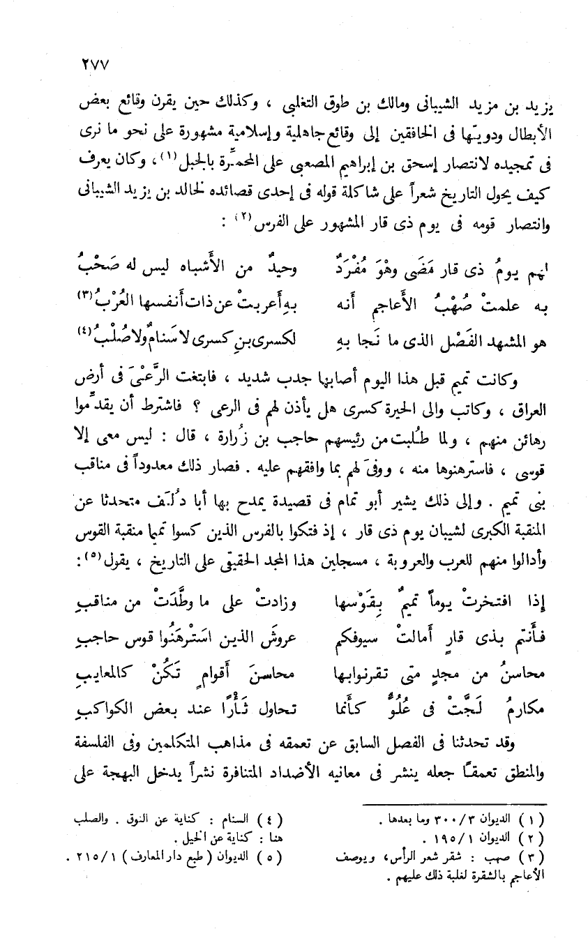 يزيد بن مزيد الشيبانى ومالك بن طوق التغلبى، وكذلك حين يقرن وقائع بعض الأبطال ودويها فى الخافقين إلى وقائع جاهلية وإسلامية مشهورة على نحو ما نرى فى تمجيده لانتصار إسحق بن إبراهيم المصعبى على المحمّرة بالجبل (¬1)، وكان يعرف كيف يحول التاريخ شعرا على شاكلة قوله فى إحدى قصائده لخالد بن يزيد الشيبانى وانتصار قومه فى يوم ذى قار المشهور على الفرس (¬2):