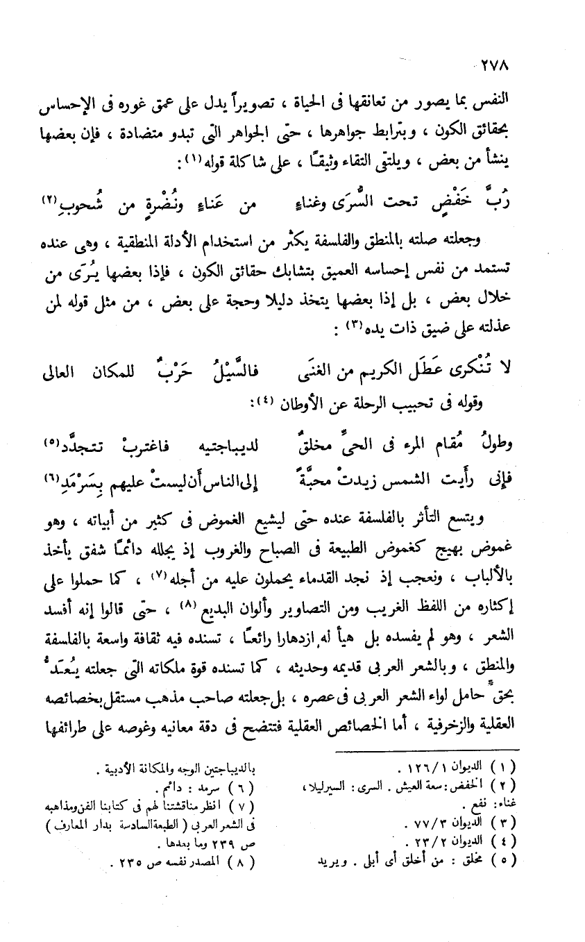 النفس بما يصور من تعانقها فى الحياة، تصويرا يدل على عمق غوره فى الإحساس بحقائق الكون، وبترابط جواهرها، حتى الجواهر التى تبدو متضادة، فإن بعضها ينشأ من بعض، ويلتقى التقاء وثيقا، على شاكلة قوله (¬1):