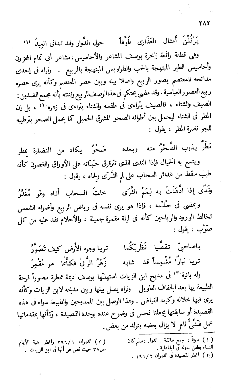 وهى قطعة رائعة زاخرة بوصف المشاعر والأحاسيس، مشاعر أبى تمام المحزون وأحاسيس الطير المبتهجة بالحب والطواويس المبتهجة بالربيع. ونراه فى إحدى مدائحه للمعتصم يصور الربيع واصلا بينه وبين عصر المعتصم وكأنه يرى عصره ربيع العصور العباسية. وقد مضى يحتكم فى هذا الوصف للربيع وفتنته بأنه مجمع الضدين: