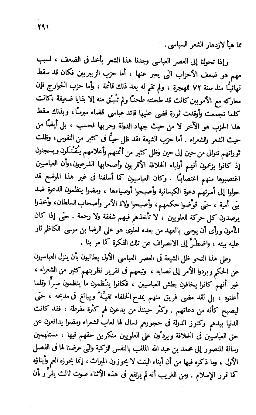 وإذا تحولنا إلى العصر العباسى وجدنا هذا الشعر يأخذ فى الضعف، لسبب مهم هو ضعف الأحزاب التى يعبر عنها، أما حزب الزبيريين فكان قد سقط نهائيّا منذ سنة 72 للهجرة، ولم تقم له بعد ذلك قائمة، وأما حزب الخوارج فإن معاركه مع الأمويين كانت قد طحنته طحنا ولم تسبق منه إلا بقايا ضعيفة، كانت كلما تجمعت وأوقدت ثورة قضى عليها قائد عباسى قضاء مبرما، وبذلك سقط هذا الحزب هو الآخر لا من حيث جهاد الدولة وحربها فحسب، بل أيضا من حيث الشعر والشعراء. أما حزب الشيعة فقد ظل حيّا فى كثير من النفوس، وظلت ثوراتهم تتوالى من حين إلى حين وظل كثير من أئمتهم وأعلامهم يقتلون ويسجنون إذ كانوا يزعمون أنهم أولياء الخلافة الأقربون وأصحابها الشرعيون، وأن العباسيين اغتصبوها منهم اغتصابا. وكان العباسيون كما أسلفنا فى غير هذا الموضع قد حولوا إلى أسرتهم دعوة الكيسانية وأصبحوا أوصياءها، ومضوا ينظمون الدعوة ضد بنى أمية، حتى قوّضوا حكمهم، وأصبحوا ولاة الأمر وأصحاب السلطان، وأخذوا يرصدون كل حركة للعلويين، لا تأخذهم فيهم شفقة ولا رحمة. حتى إذا كان المأمون ورأى أن يوصى بالعهد من بعده لعلوى هو على الرضا بن موسى الكاظم ثار عليه بيته، واضطرّ إلى الانصراف عن تلك الفكرة كما مر بنا.