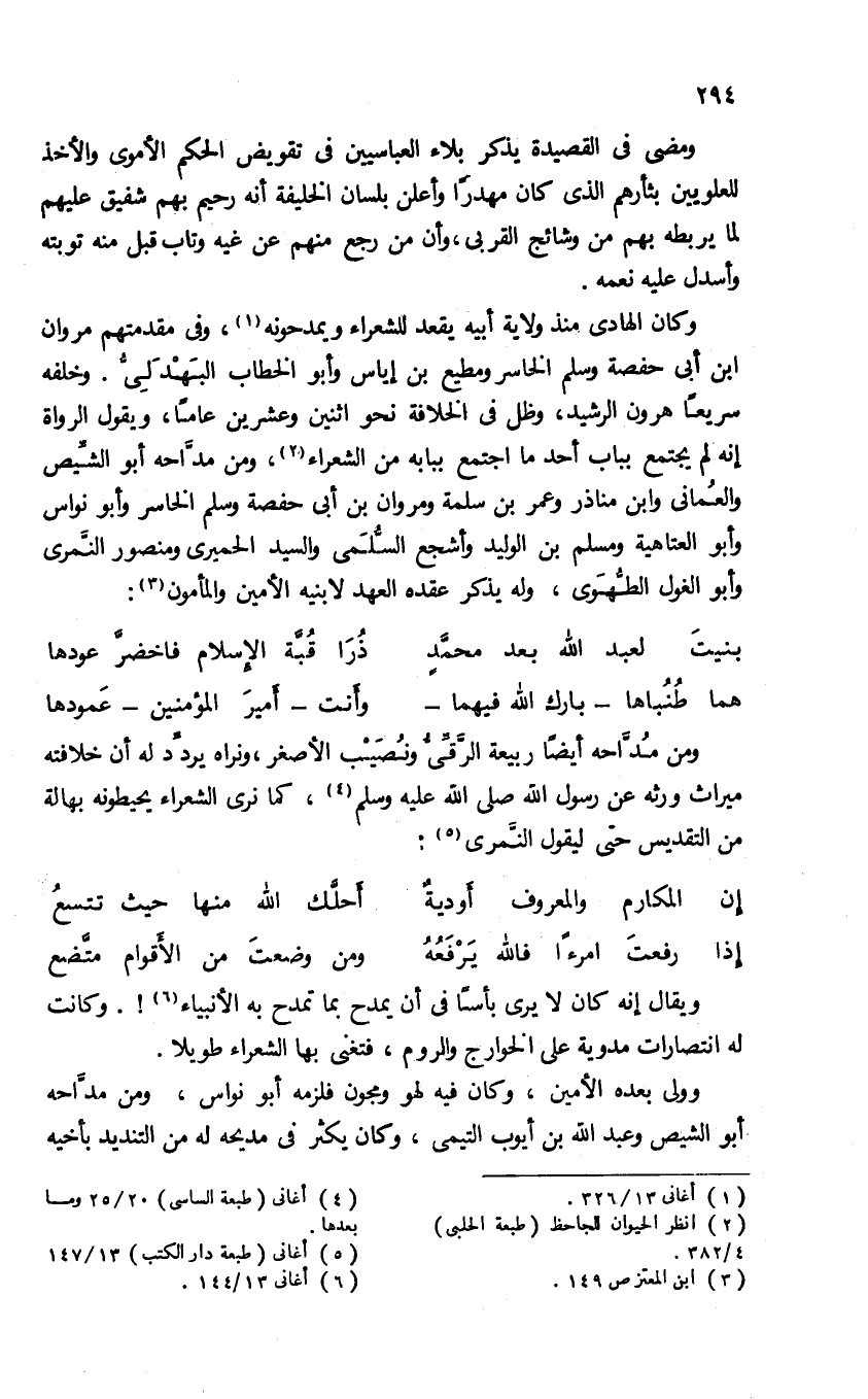 وكان الهادى منذ ولاية أبيه يقعد للشعراء ويمدحونه (¬1)، وفى مقدمتهم مروان ابن أبى حفصة وسلم الخاسر ومطيع بن إياس وأبو الخطاب البهدلىّ. وخلفه سريعا هرون الرشيد، وظل فى الخلافة نحو اثنين وعشرين عاما، ويقول الرواة إنه لم يجتمع بباب أحد ما اجتمع ببابه من الشعراء (¬2)، ومن مدّاحه أبو الشّيص والعمانى وابن مناذر وعمر بن سلمة ومروان بن أبى حفصة وسلم الخاسر وأبو نواس وأبو العتاهية ومسلم بن الوليد وأشجع السّلمى والسيد الحميرى ومنصور النّمرى وأبو الغول الطّهوى، وله يذكر عقده العهد لابنيه الأمين والمأمون (¬3):
