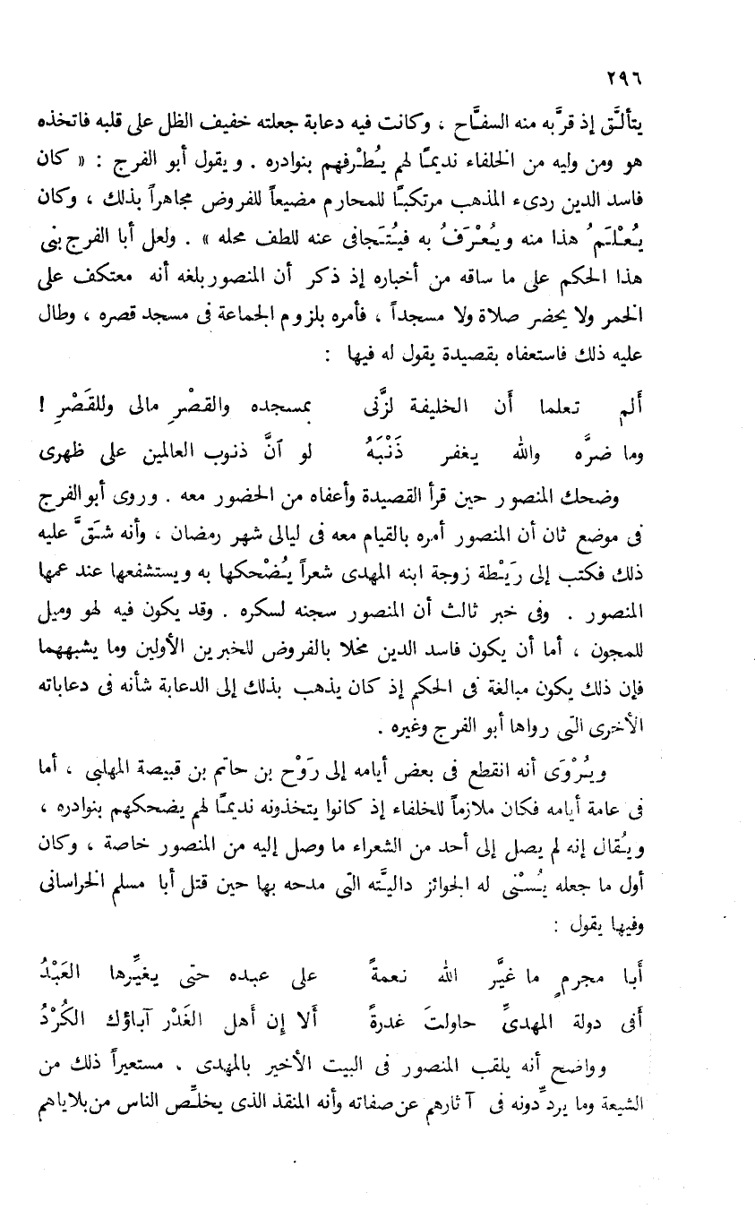 وضحك المنصور حين قرأ القصيدة وأعفاه من الحضور معه. وروى أبو الفرج فى موضع ثان أن المنصور أمره بالقيام معه فى ليالى شهر رمضان. وأنه شقّ عليه ذلك فكتب إلى ريطة زوجة ابنه المهدى شعرا يضحكها به ويستشفعها عند عمها المنصور. وفى خبر ثالث أن المنصور سجنه لسكره. وقد يكون فيه لهو وميل للمجون. أما أن يكون فاسد الدين مخلا بالفروض للخبرين الأولين وما يشبههما فإن ذلك يكون مبالغة فى الحكم إذ كان يذهب بذلك إلى الدعابة شأنه فى دعاباته الأخرى التى رواها أبو الفرج وغيره.