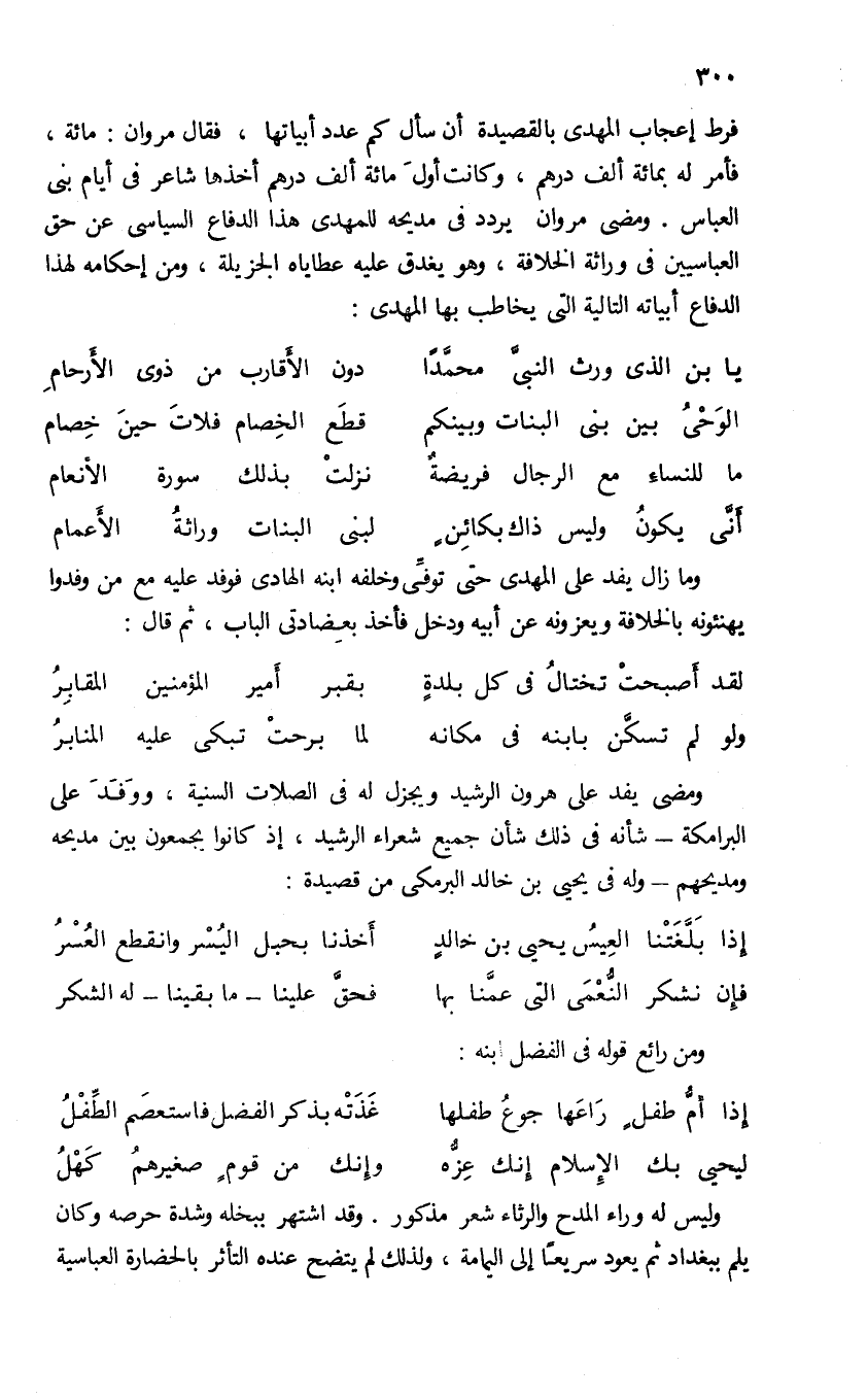 فرط إعجاب المهدى بالقصيدة أن سأل كم عدد أبياتها، فقال مروان: مائة، فأمر له بمائة ألف درهم، وكانت أول مائة ألف درهم أخذها شاعر فى أيام بنى العباس. ومضى مروان يردد فى مديحه للمهدى هذا الدفاع السياسى عن حق العباسيين فى وراثة الخلافة، وهو يغدق عليه عطاياه الجزيلة، ومن إحكامه لهذا الدفاع أبياته التالية التى يخاطب بها المهدى: