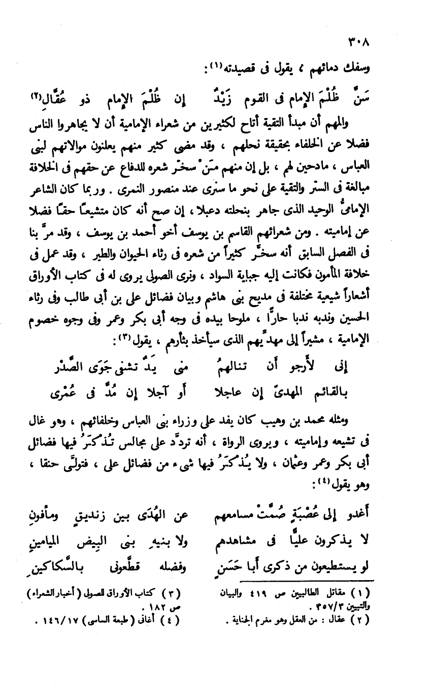 والمهم أن مبدأ التقية أتاح لكثيرين من شعراء الإمامية أن لا يجاهروا الناس فضلا عن الخلفاء بحقيقة نحلهم، وقد مضى كثير منهم يعلنون موالاتهم لبنى العباس، مادحين لهم، بل إن منهم من سخّر شعره للدفاع عن حقهم فى الخلافة مبالغة فى الستر والتقية على نحو ما سنرى عند منصور النمرى. وربما كان الشاعر الإمامىّ الوحيد الذى جاهر بنحلته دعبلا، إن صح أنه كان متشيعا حقّا فضلا عن إماميته. ومن شعرائهم القاسم بن يوسف أخو أحمد بن يوسف، وقد مرّ بنا فى الفصل السابق أنه سخّر كثيرا من شعره فى رثاء الحيوان والطير، وقد عمل فى خلافة المأمون فكانت إليه جباية السواد، ونرى الصولى يروى له فى كتاب الأوراق أشعارا شيعية مختلفة فى مديح بنى هاشم وبيان فضائل على بن أبى طالب وفى رثاء الحسين وندبه ندبا حارّا، ملوحا بيده فى وجه أبى بكر وعمر وفى وجوه خصوم الإمامية، مشيرا إلى مهدّيهم الذى سيأخذ بثأرهم، يقول (¬3):