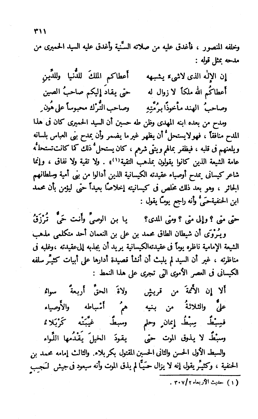 ومدح من بعده ابنه المهدى وظن طه حسين أن السيد الحميرى كان فى هذا المدح منافقا، فهو لا يستحلّ أن يظهر غير ما يضمر وأن يمدح بنى العباس بلسانه ويلعنهم فى قلبه، فيظفر بمالهم ويتقى شرهم، كان يستحلّ ذلك كما كانت تستحلّه عامة الشيعة الذين كانوا يقولون بمذهب التقية (¬1)». ولا تقية ولا نفاق، وإنما شاعر كيسانى بمدح أوصياء عقيدته الكيسانية الذين أدالوا من بنى أمية وسلطانهم الجائر، وهو بعد ذلك مخلص فى كيسانيته إخلاصا بعيدا حتى ليؤمن بأن محمد ابن الحنفية حىّ وأنه راجع يوما يقول:
