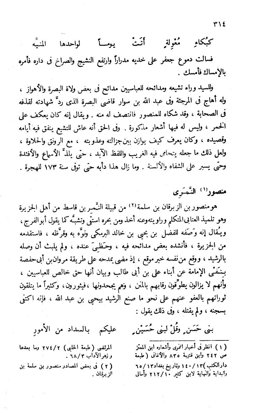 (¬1) انظر فى أخبار النمرى وأشعاره ابن المعتز ص 242 وابن قنيبة 835 والأغانى (طبعة دار الكتب) 13/ 140 وتاريخ بغداد 13/ 65 والبداية والنهاية لابن كثير 10/ 212 وأمالى المرتضى (طبعة الحلبى) 2/ 274 وما بعدها وزهر الآداب 3/ 68.