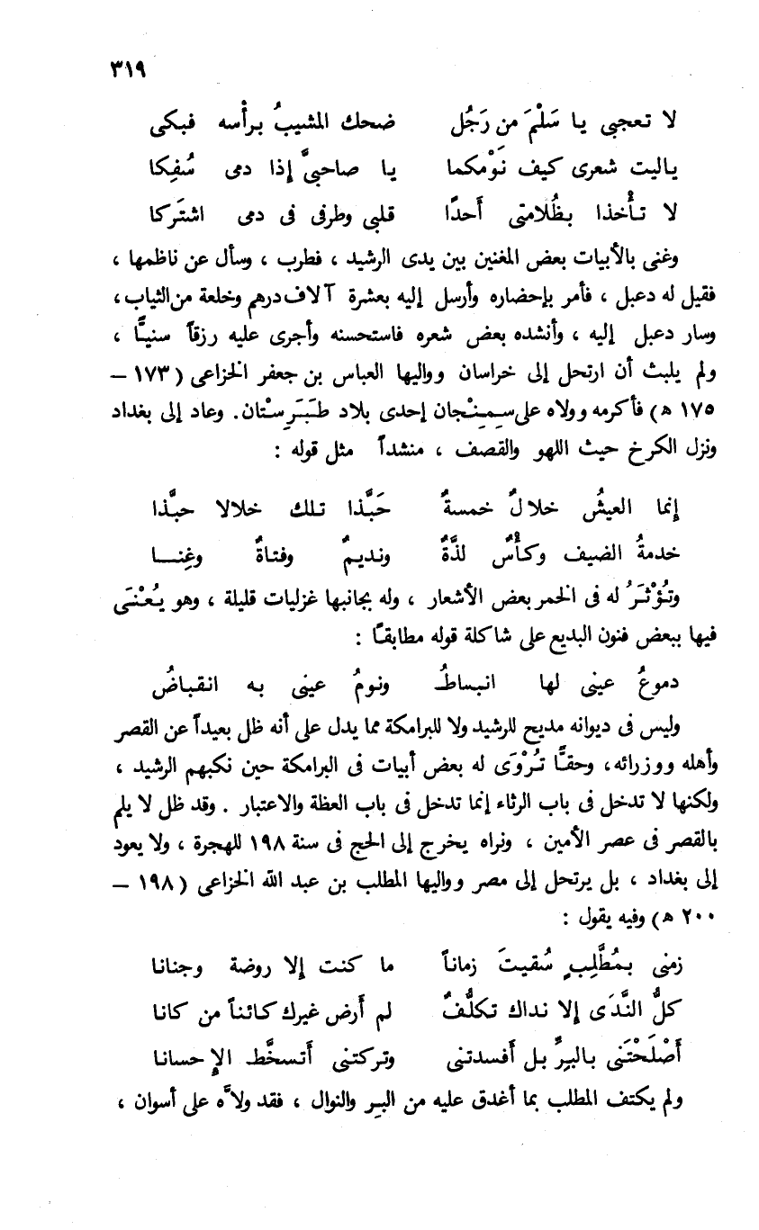 وليس فى ديوانه مديح للرشيد ولا للبرامكة مما يدل على أنه ظل بعيدا عن القصر وأهله ووزرائه، وحقّا تروى له بعض أبيات فى البرامكة حين نكبهم الرشيد، ولكنها لا تدخل فى باب الرثاء إنما تدخل فى باب العظمة والاعتبار. وقد ظل لا يلم بالقصر فى عصر الأمين، ونراه يخرج إلى الحج فى سنة 198 للهجرة، ولا يعود إلى بغداد، بل يرتحل إلى مصر وواليها المطلب بن عبد الله الخزاعى (198 - 200 هـ) وفيه يقول: