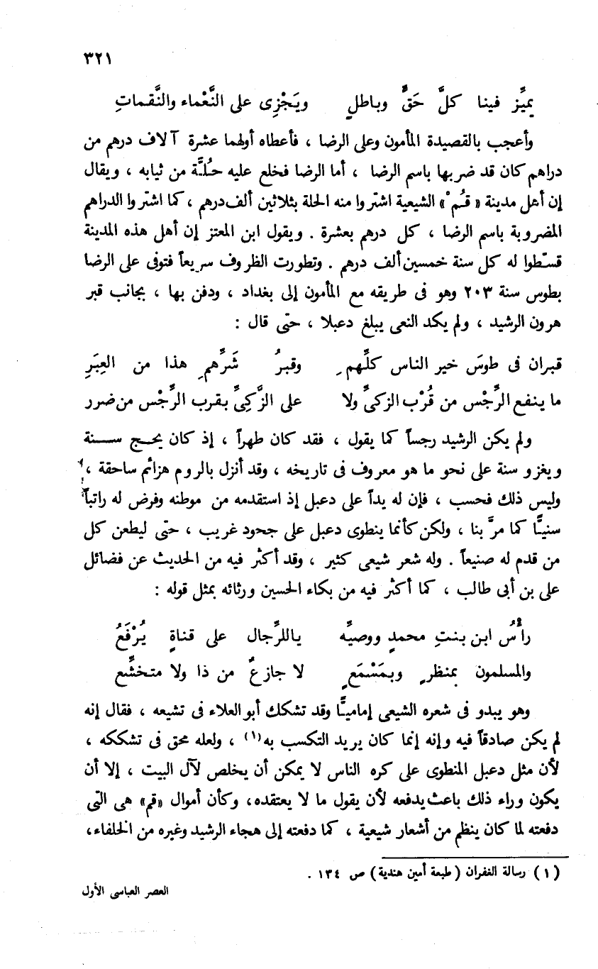 وهو يبدو فى شعره الشيعى إماميّا وقد تشكك أبو العلاء فى تشيعه، فقال إنه لم يكن صادقا فيه وإنه إنما كان يريد التكسب به (¬1)، ولعله محق فى تشككه، لأن مثل دعبل المنطوى على كره الناس لا يمكن أن يخلص لآل البيت، إلا أن يكون وراء ذلك باعث يدفعه لأن يقول ما لا يعتقده، وكأن أموال «قم» هى التى دفعته لما كان ينظم من أشعار شيعية، كما دفعته إلى هجاء الرشيد وغيره من الخلفاء،