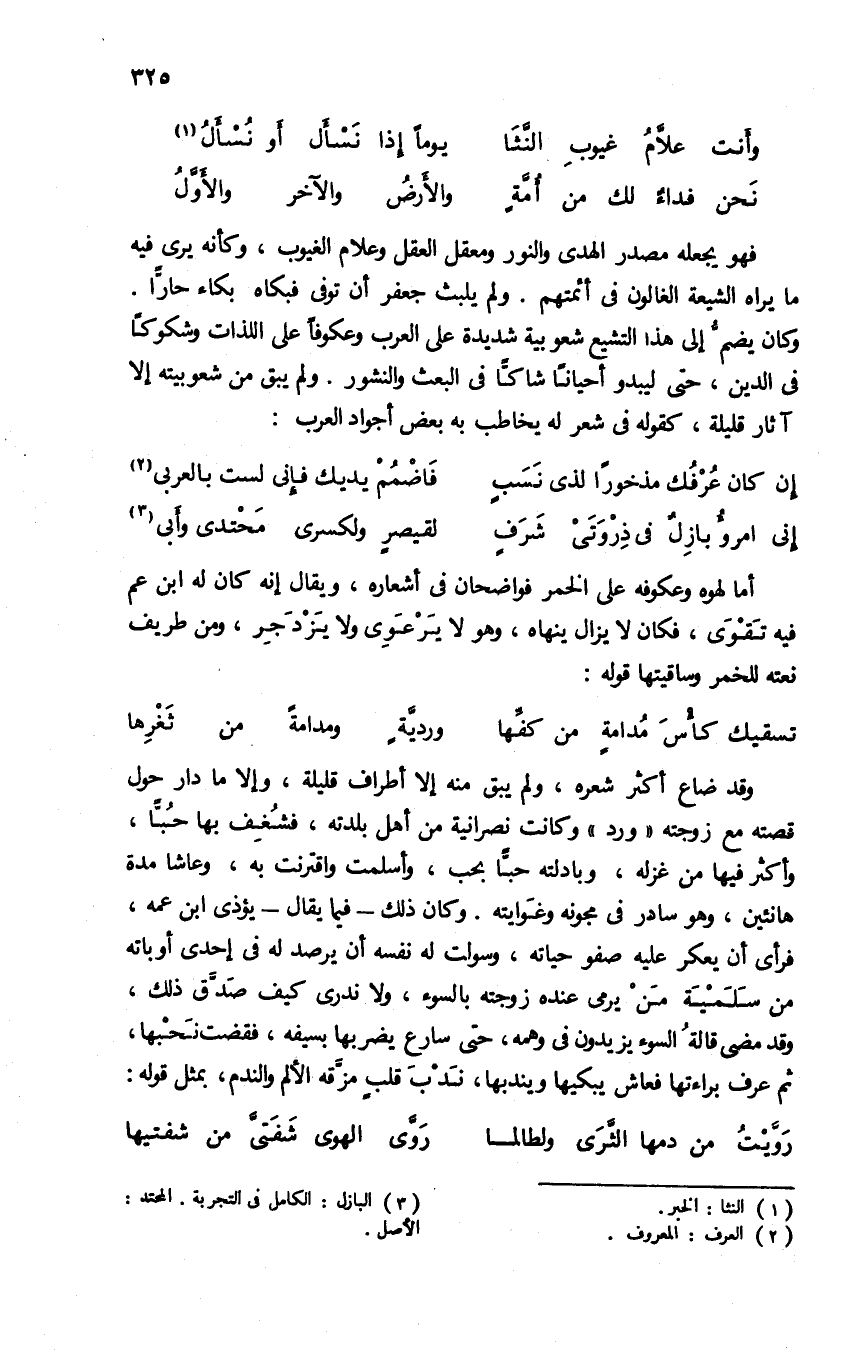 وكان يضمّ إلى هذا التشيع شعوبية شديدة على العرب وعكوفا على اللذات وشكوكا فى الدين، حتى ليبدو أحيانا شاكّا فى البعث والنشور. ولم يبق من شعوبيته إلا آثار قليلة، كقوله فى شعر له يخاطب به بعض أجواد العرب: