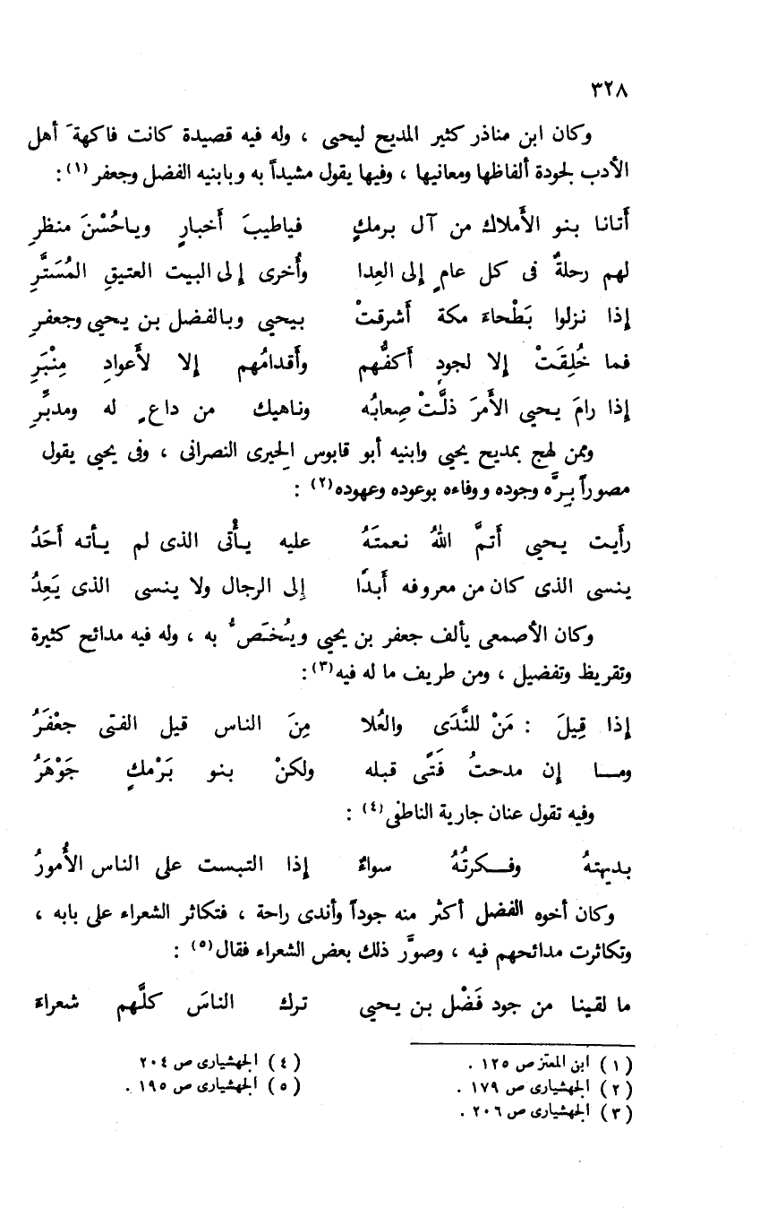 وكان ابن مناذر كثير المديح ليحيى، وله فيه قصيدة كانت فاكهة أهل الأدب لجودة ألفاظها ومعانيها، وفيها يقول مشيدا به وبابنيه الفضل وجعفر (¬1):