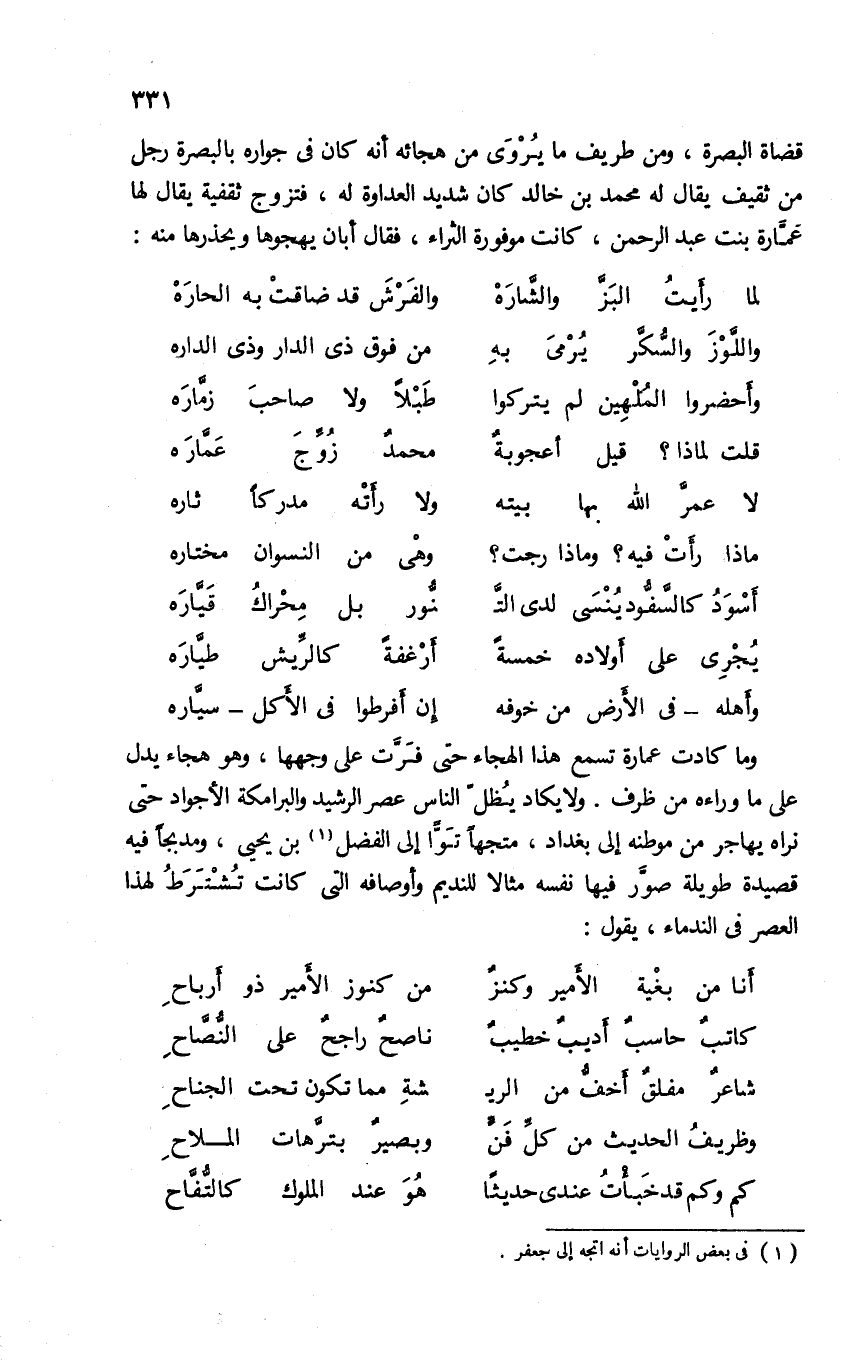 وما كادت عمارة تسمع هذا الهجاء حتى فرّت على وجهها، وهو هجاء يدل على ما وراءه من ظرف. ولا يكاد يظلّ الناس عصر الرشيد والبرامكة الأجواد حتى نراه يهاجر من موطنه إلى بغداد، متجها توّا إلى الفضل (¬1). يحيى، ومدبجا فيه قصيدة طويلة صوّر فيها نفسه مثالا للنديم وأوصافه التى كانت تشترط لهذا العصر فى الندماء، يقول: