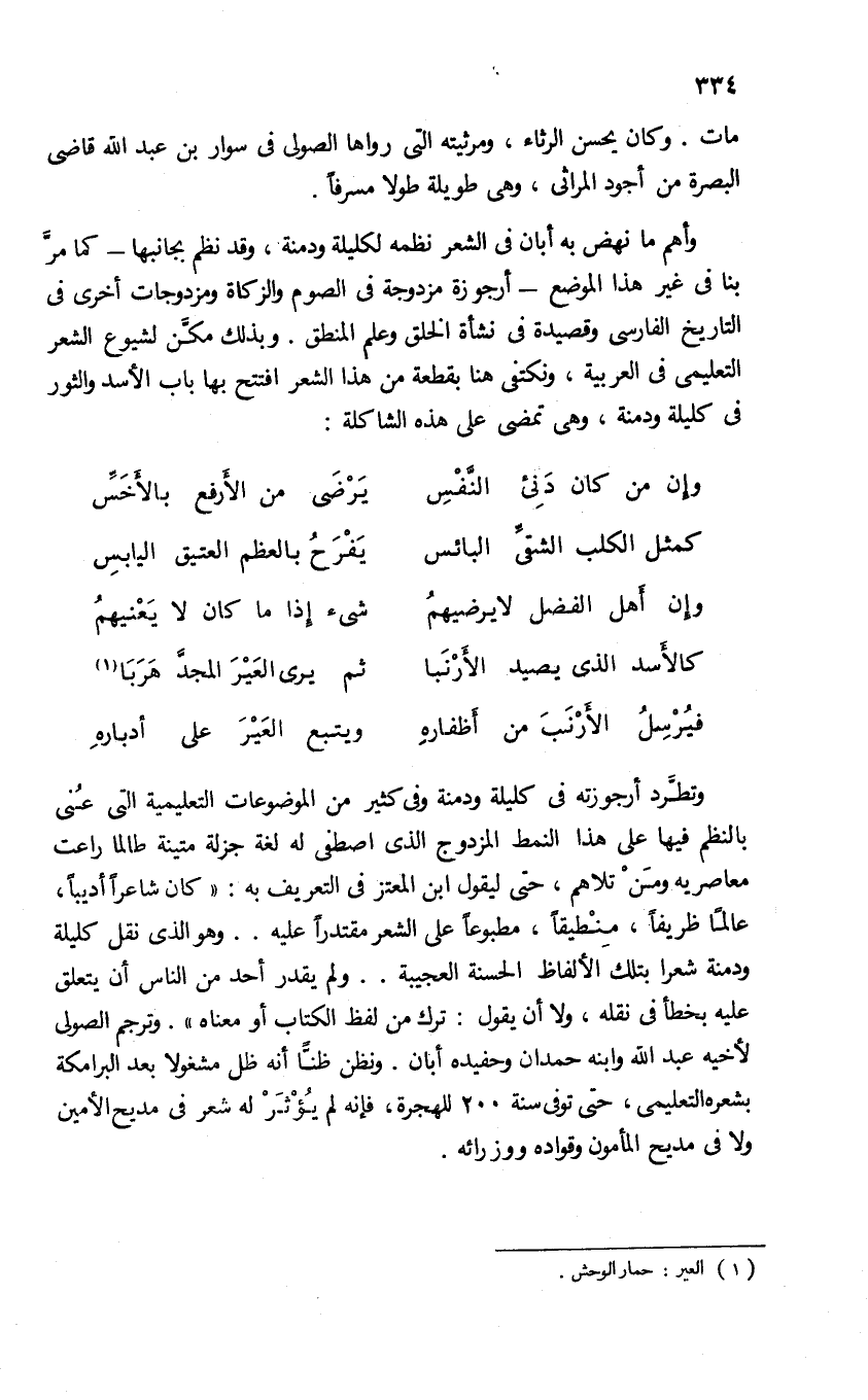 وتطّرد أرجوزته فى كليلة ودمنة وفى كثير من الموضوعات التعليمية التى عنى بالنظم فيها على هذا النمط المزدوج الذى اصطفى له لغة جزلة متينة طالما راعت معاصريه ومن تلاهم، حتى ليقول ابن المعتز فى التعريف به: «كان شاعرا أديبا، عالما ظريفا، منطيقا، مطبوعا على الشعر مقتدرا عليه. . وهو الذى نقل كليلة ودمنة شعرا بتلك الألفاظ الحسنة العجيبة. . ولم يقدر أحد من الناس أن يتعلق عليه بخطأ فى نقله، ولا أن يقول: ترك من لفظ الكتاب أو معناه». وترجم الصولى لأخيه عبد الله وابنه حمدان وحفيده أبان. ونظن ظنّا أنه ظل مشغولا بعد البرامكة بشعره التعليمى، حتى توفى سنة 200 للهجرة، فإنه لم يؤثر له شعر فى مديح الأمين ولا فى مديح المأمون وقواده ووزرائه.