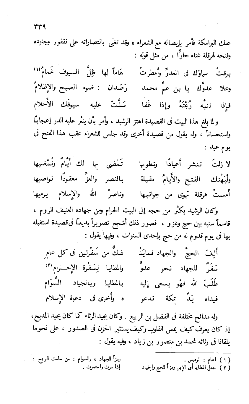 عنك البرامكة فأمر بإيصاله مع الشعراء» وقد تغنى بانتصاراته على نقفور وجنوده وفتحه لهرقلة غناء حارّا، من مثل قوله: