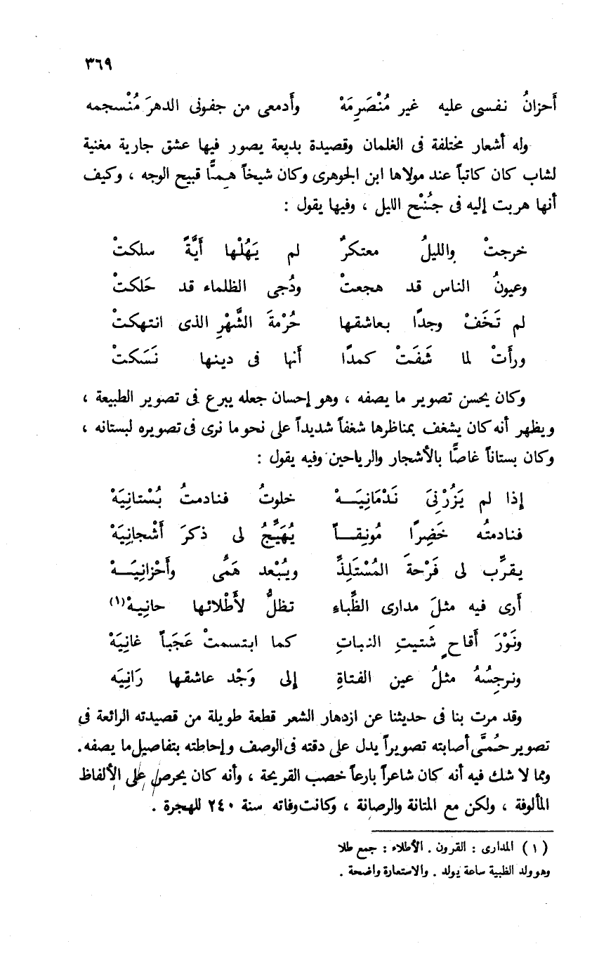 وقد مرت بنا فى حديثنا عن ازدهار الشعر قطعة طويلة من قصيدته الرائعة فى تصوير حمّى أصابته تصويرا يدل على دقته فى الوصف وإحاطته بتفاصيل ما يصفه.