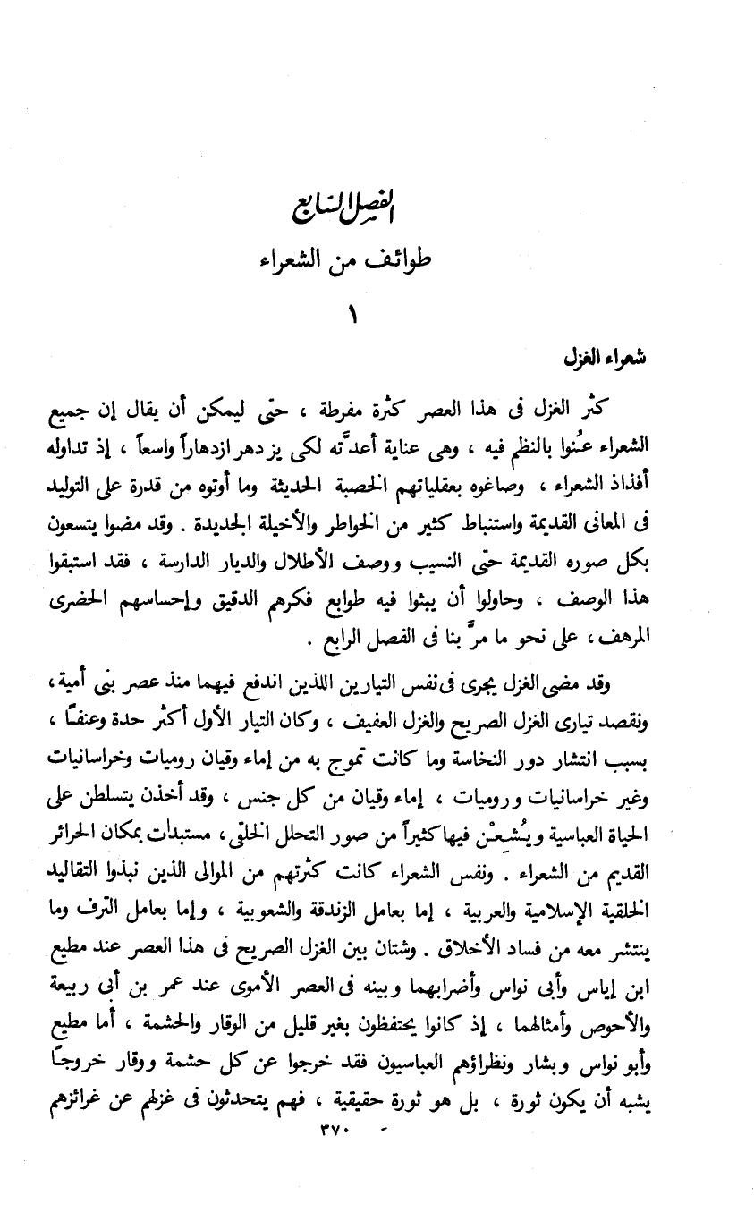 وقد مضى الغزل يجرى فى نفس التيارين اللذين اندفع فيهما منذ عصر بنى أمية، ونقصد تيارى الغزل الصريح والغزل العفيف، وكان التيار الأول أكثر حدة وعنفا، بسبب انتشار دور النخاسة وما كانت تموج به من إماء وقيان روميات وخراسانيات وغير خراسانيات وروميات، إماء وقيان من كل جنس، وقد أخذن يتسلطن على الحياة العباسية ويشعن فيها كثيرا من صور التحلل الخلقى، مستبدات بمكان الحرائر القديم من الشعراء. ونفس الشعراء كانت كثرتهم من الموالى الذين نبذوا التقاليد الخلقية الإسلامية والعربية، إما بعامل الزندقة والشعوبية، وإما بعامل الترف وما ينتشر معه من فساد الأخلاق. وشتان بين الغزل للصريح فى هذا العصر عند مطيع ابن إياس وأبى نواس وأضرابهما وبينه فى العصر الأموى عند عمر بن أبى ربيعة والأحوص وأمثالهما، إذ كانوا يحتفظون بغير قليل من الوقار والحشمة، أما مطيع وأبو نواس وبشار ونظراؤهم العباسيون فقد خرجوا عن كل حشمة ووقار خروجا؟ ؟ ؟ ، يكون ثورة، بل هو ثورة حقيقية، فهم يتحدثون فى غزلهم عن غرائزهم