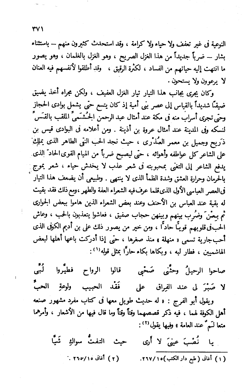 وكان يجرى بجانب هذا التيار تيار الغزل العفيف، ولكن مجراه أخذ يضيق ضيقا شديدا بالقياس إلى عصر بنى أمية إذ كان يتسع حتى يشمل بوادى الحجاز وحتى تجرى أسراب منه فى مكة عند أمثال عبد الرحمن الجشمىّ الملقب بالقسّ لنسكه وفى المدينة عند أمثال عروة بن أذينة. ومن أعلامه فى البوادى قيس بن ذريح وجميل بن معمر العذرى، حيث نجد الحب النقى الطاهر الذى يملك على الشاعر كل عواطفه وأهوائه، حتى ليصبح ضربا من الهيام القوى الحادّ الذى يدفع الشاعر إلى التغنى بمحبوبته فى شعر عذب لا يخدش حياء، شعر يموج بالحرمان وحرارة العشق وشدة الظمأ الذى لا ينتهى. وطبيعى أن يضعف هذا التيار فى العصر العباسى الأول الذى قلما عرف فيه الشعراء العفة والطهر، ومع ذلك فقد بقيت له بقية عند العباس بن الأحنف وعند بعض الشعراء الذين هاموا ببعض الجوارى ثم بعن وضرب بينهم وبينهن حجاب صفيق، فعاشوا يتعذبون بالحب، وعاش الحب فى قلوبهم قويّا حادّا، ومن خير من يصور ذلك على بن أديم الكوفى الذى أحب جارية تسمى «منهلة» منذ صغرها، حتى إذا أدركت باعها أهلها لبعض الهاشميين، فطار لبه، وبكاها بكاء حارّا بمثل قوله (¬1):