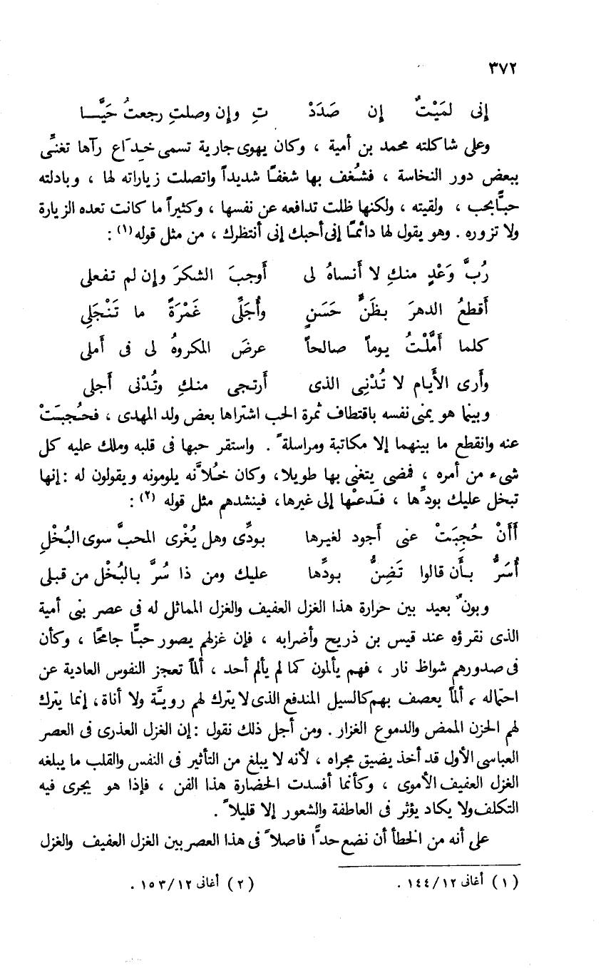 وبون بعيد بين حرارة هذا الغزل العفيف والغزل المماثل له فى عصر بنى أمية الذى نقرؤه عند قيس بن ذريح وأضرابه، فإن غزلهم يصور حبّا جامحا، وكأن فى صدورهم شواظ نار، فهم يألمون كما لم يألم أحد، ألما تعجز النفوس العادية عن احتماله، ألما يعصف بهم كالسيل المندفع الذى لا يترك لهم رويّة ولا أناة، إنما يترك لهم الحزن الممض والدموع الغزار. ومن أجل ذلك نقول: إن الغزل العذرى فى العصر العباسى الأول قد أخذ يضيق مجراه. لأنه لا يبلغ من التأثير فى النفس والقلب ما يبلغه الغزل العفيف الأموى، وكأنما أفسدت الحضارة هذا الفن، فإذا هو يجرى فيه التكلف ولا يكاد يؤثر فى العاطفة والشعور إلا قليلا.