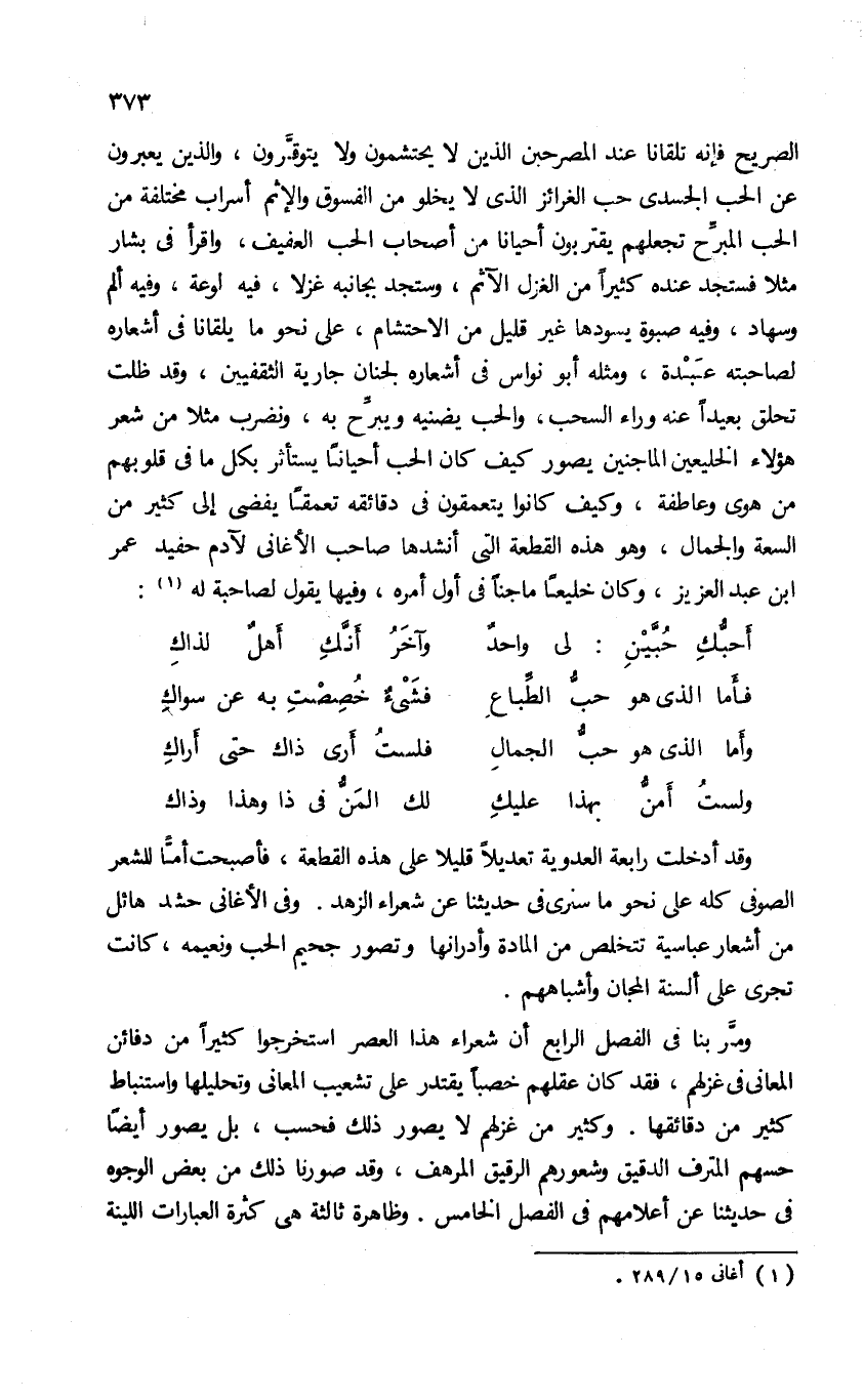 الصريح فإنه تلقانا عند المصرحين الذين لا يحتشمون ولا يتوقّرون، والذين يعبرون عن الحب الجسدى حب الغرائز الذى لا يخلو من الفسوق والإثم أسراب مختلفة من الحب المبرّح تجعلهم يقتربون أحيانا من أصحاب الحب العفيف، واقرأ فى بشار مثلا فستجد عنده كثيرا من الغزل الآثم، وستجد بجانبه غزلا، فيه لوعة. وفيه ألم وسهاد، وفيه صبوة يسودها غير قليل من الاحتشام، على نحو ما يلقانا فى أشعاره لصاحبته عبدة، ومثله أبو نواس فى أشعاره لجنان جارية الثقفين، وقد ظلت تحلق بعيدا عنه وراء السحب. والحب يضنيه ويبرّح به، ونضرب مثلا من شعر هؤلاء الخليعين الماجنين يصور كيف كان الحب أحيانا يستأثر بكل ما فى قلوبهم من هوى وعاطفة، وكيف كانوا يتعمقون فى دقائقه تعمقا يفضى إلى كثير من السعة والجمال، وهو هذه القطعة التى أنشدها صاحب الأغانى لآدم حفيد عمر ابن عبد العزيز، وكان خليعا ماجنا فى أول أمره، وفيها يقول لصاحبة له (¬1):