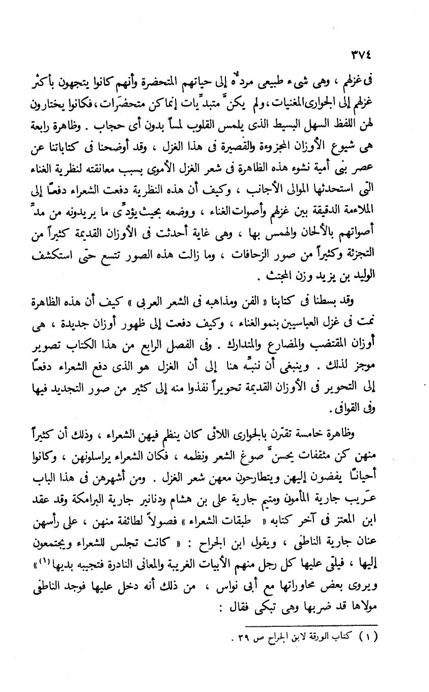 وقد بسطنا فى كتابنا «الفن ومذاهبه فى الشعر العربى» كيف أن هذه الظاهرة نمت فى غزل العباسيين بنمو الغناء، وكيف دفعت إلى ظهور أوزان جديدة، هى أوزان المقتضب والمضارع والمتدارك. وفى الفصل الرابع من هذا الكتاب تصوير موجز لذلك. وينبغى أن ننبّه هنا إلى أن الغزل هو الذى دفع الشعراء دفعا إلى التحوير فى الأوزان القديمة تحويرا نفذوا منه إلى كثير من صور التجديد فيها وفى القوافى.