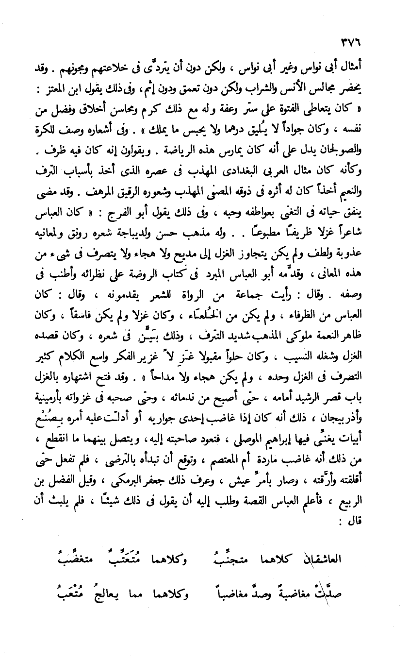 أمثال أبى نواس وغير أبى نواس، ولكن دون أن يتردّى فى خلاعتهم ومجونهم. وقد يحضر مجالس الأنس والشراب ولكن دون تعمق ودون إثم، وفى ذلك يقول ابن المعتز: