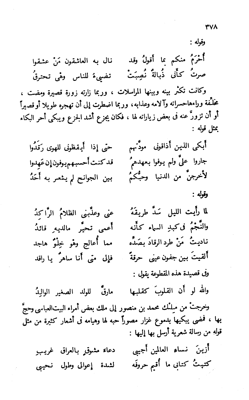 وخرجت من ملك محمد بن منصور إلى ملك بعض أمراء البيت العباسى وحجّ بها، فمضى يبكيها بدموع غزار مصورا حبه لها وهيامه فى أشعار كثيرة من مثل قوله من رسالة شعرية أرسل بها إليها: