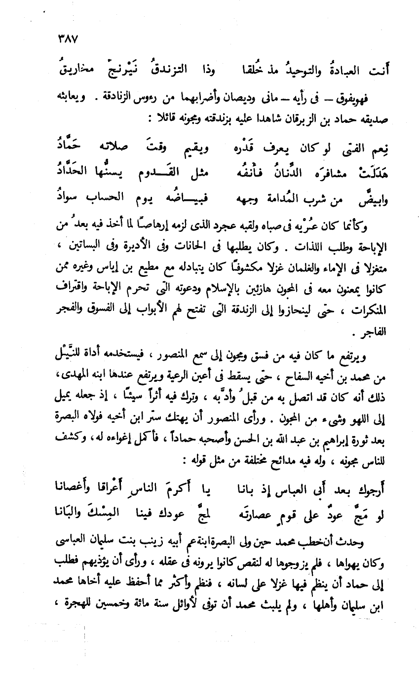 فهو يفوق-فى رأيه-مانى وديصان وأضرابهما من رءوس الزنادقة. ويعابثه صديقه حماد بن الزبرقان شاهدا عليه بزندقته ومجونه قائلا: