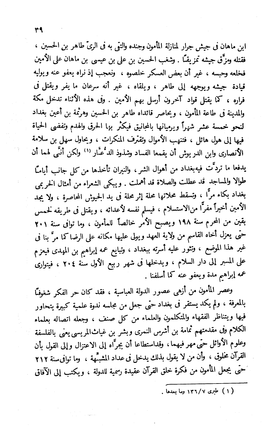 ابن ماهان فى جيش جرار لمنازلة المأمون وجنده والتقى به فى الرىّ طاهر بن الحسين، فقتله ومزّق جيشه تمزيقا. وشغب الحسين بن على بن عيسى بن ماهان على الأمين فخلعه وحبسه، غير أن بعض العسكر خلصوه، ونعجب إذ نراه يعفو عنه ويوليه قيادة جيشه ويوجهه إلى طاهر، ويلقاه، غير أنه سرعان ما يفر ويقتل فى فراره، كما يقتل قواد آخرون أرسل بهم الأمين. وفى هذه الأثناء تدخل مكة والمدينة فى طاعة المأمون، ويحاصر قائداه طاهر بن الحسين وهرثمة بن أعين بغداد لنحو خمسة عشر شهرا ويرميانها بالمجانيق فيكثر بها الحرق والهدم وتفضى الحياة فيها إلى هول هائل، فتنهب الأموال وتقترف المنكرات، ويحاول سهل بن سلامة الأنصارى وابن الدريوش أن يقمعا الفساد وشذوذ الدّعّار (¬1) ولكن أنّى لهما أن يدفعا ما تردّت فيه بغداد من أهوال الشر، والنيران تأخذها من كل جانب أياما طوالا والمساجد قد عطلت والصلاة قد أهملت. ويبكى الشعراء من أمثال الخريمى بغداد بكاء مرّا، وتسقط محلاتها محلة إثر محلة فى يد الجيوش المحاصرة، ولا يجد الأمين أخيرا مفرّا من الاستسلام، فيسلم نفسه لأعدائه، ويقتل فى طريقه لخمس بقين من المحرم سنة 198 ويصبح الأمر خالصا للمأمون، وما توافى سنة 201 حتى يعزل أخاه القاسم من ولاية العهد ويولى عليها مكانه على الرضا كما مرّ بنا فى غير هذا الموضع، وتثور عليه أسرته ببغداد، وتبايع عمه إبراهيم بن المهدى فيعزم على المسير إلى دار السلام، ويدخلها فى شهر ربيع الأول سنة 204، فيتوارى عمه إبراهيم مدة ويعفو عنه كما أسلفنا.