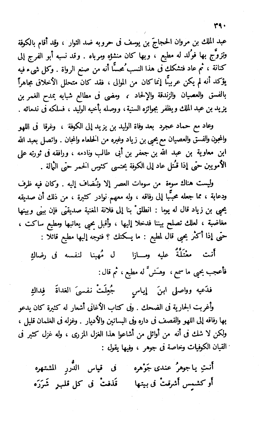 وأغربت الجارية فى الضحك. وفى كتاب الأغانى أشعار له كثيرة كان يدعو بها رفاقه إلى اللهو والقصف فى داره وفى البساتين والأديار. وغزله فى الغلمان قليل، ولكن لا شك فى أنه من أوائل من أشاعوا هذا الغزل المزرى، وله غزل كثير فى القيان الكوفيات وخاصة فى جوهر، وفيها يقول: