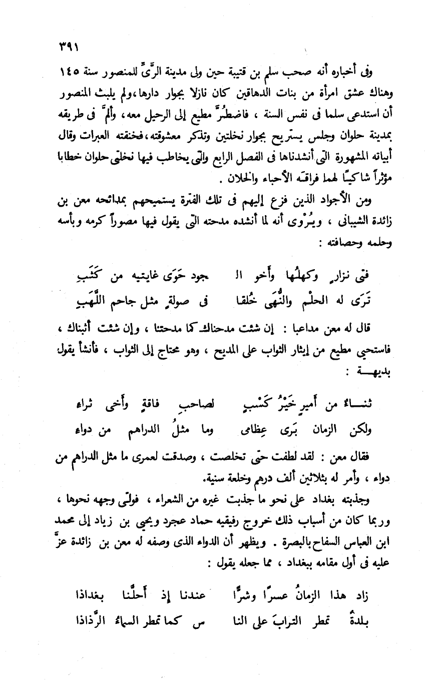 ومن الأجواد الذين فزع إليهم فى تلك الفترة يستميحهم بمدائحه معن بن زائدة الشيبانى، ويروى أنه لما أنشده مدحته التى يقول فيها مصورا كرمه وبأسه وحلمه وحصافته:
