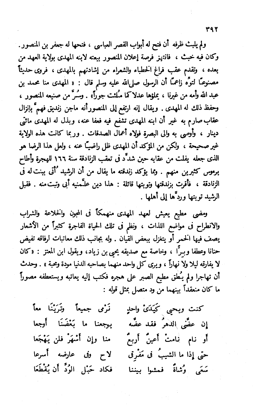 وكان فيه خبث، فانتهز فرصة إعلان المنصور بيعته لابنه المهدى بولاية العهد من بعده، وتقدم عقب فراغ الخطباء والشعراء من إشادتهم بالمهدى، فروى حديثا مصنوعا لتوّه زاعما أن الرسول صلى الله عليه وسلم قال: «المهدى منا محمد بن عبد الله وأمه من غيرنا، يملؤها عدلا كما ملئت جورا». وسرّ من صنيعه المنصور، وحفظ ذلك له المهدى. ويقال إنه ارتفع إلى المنصور أنه ماجن زنديق فهمّ بإنزال عقاب صارم به غير أن ابنه المهدى تشفع فيه فعفا عنه، وبذل له المهدى مائتى دينار، وأوصى به والى البصرة فولاه أعمال الصدقات. وربما كانت هذه الولاية غير صحيحة، ولكن من المؤكد أن المهدى ظل راضيا عنه، ولعل هذا الرضا هو الذى جعله يفلت من عقابه حين شدّد فى تعقب الزنادقة سنة 166 للهجرة وأطاح يرءوس كثيرين منهم. ومما يؤكد زندقته ما يقال من أن الرشيد أتى ببنت له فى الزنادقة، فأقرت بزندقتها وتوبتها قائلة: هذا دين علّمنيه أبى وتبت منه. فقيل الرشيد توبتها وردّها إلى أهلها.
