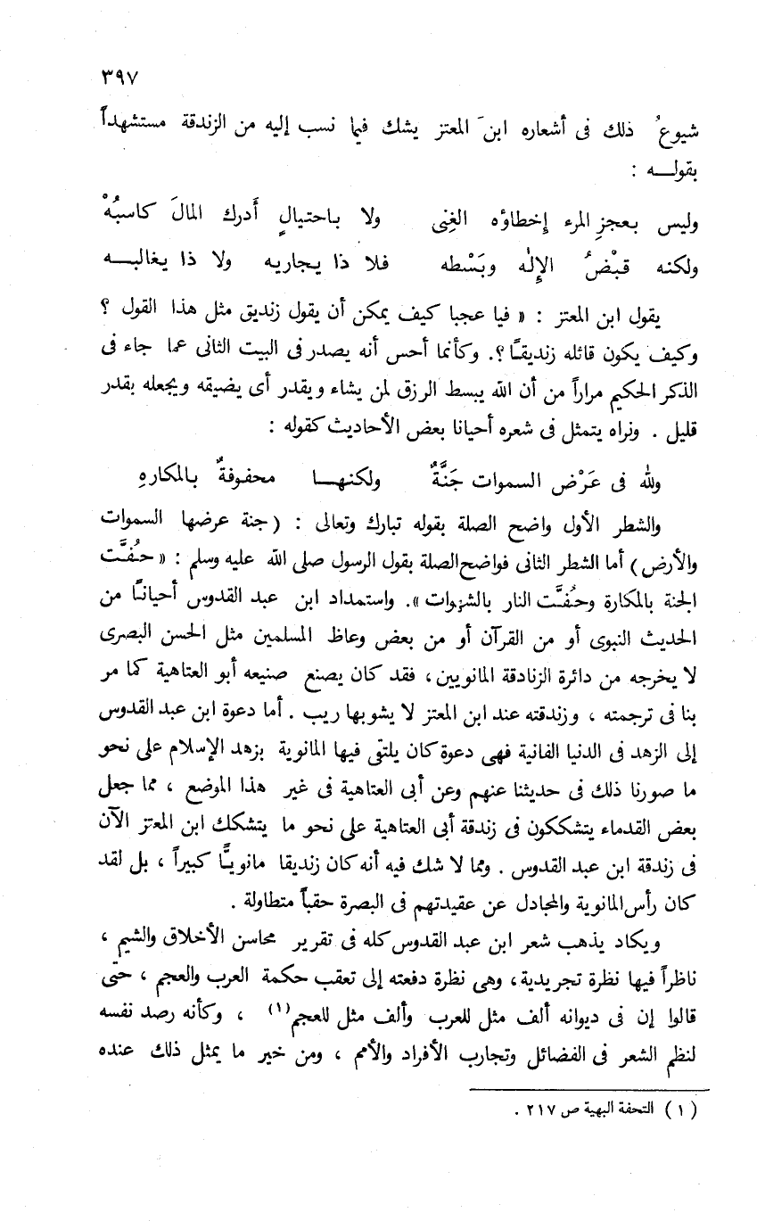 والشطر الأول واضح الصلة بقوله تبارك وتعالى: ({جَنَّةٍ عَرْضُهَا السَّماواتُ وَالْأَرْضُ}) أما الشطر الثانى فواضح الصلة بقول الرسول صلى الله عليه وسلم: «حفّت الجنة بالمكارة وحفّت النار بالشهوات». واستمداد ابن عبد القدوس أحيانا من الحديث النبوى أو من القرآن أو من بعض وعاظ المسلمين مثل الحسن البصرى لا يخرجه من دائرة الزنادقة المانويين، فقد كان يصنع صنيعه أبو العتاهية كما مر بنا فى ترجمته، وزندقته عند ابن المعتز لا يشوبها ريب. أما دعوة ابن عبد القدوس إلى الزهد فى الدنيا الفانية فهى دعوة كان يلتقى فيها المانوية بزهد الإسلام على نحو ما صورنا ذلك فى حديثنا عنهم وعن أبى العتاهية فى غير هذا الموضع، مما جعل بعض القدماء يتشككون فى زندقة أبى العتاهية على نحو ما يتشكك ابن المعتز الآن فى زندقة ابن عبد القدوس. ومما لا شك فيه أنه كان زنديقا مانويّا كبيرا، بل لقد كان رأس المانوية والمجادل عن عقيدتهم فى البصرة حقبا متطاولة.
