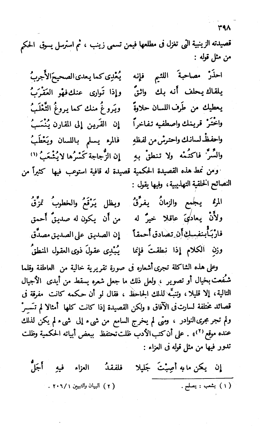 قصيدته الزينبية التى تغزل فى مطلعها فيمن تسمى زينب، ثم استرسل يسوق الحكم من مثل قوله: