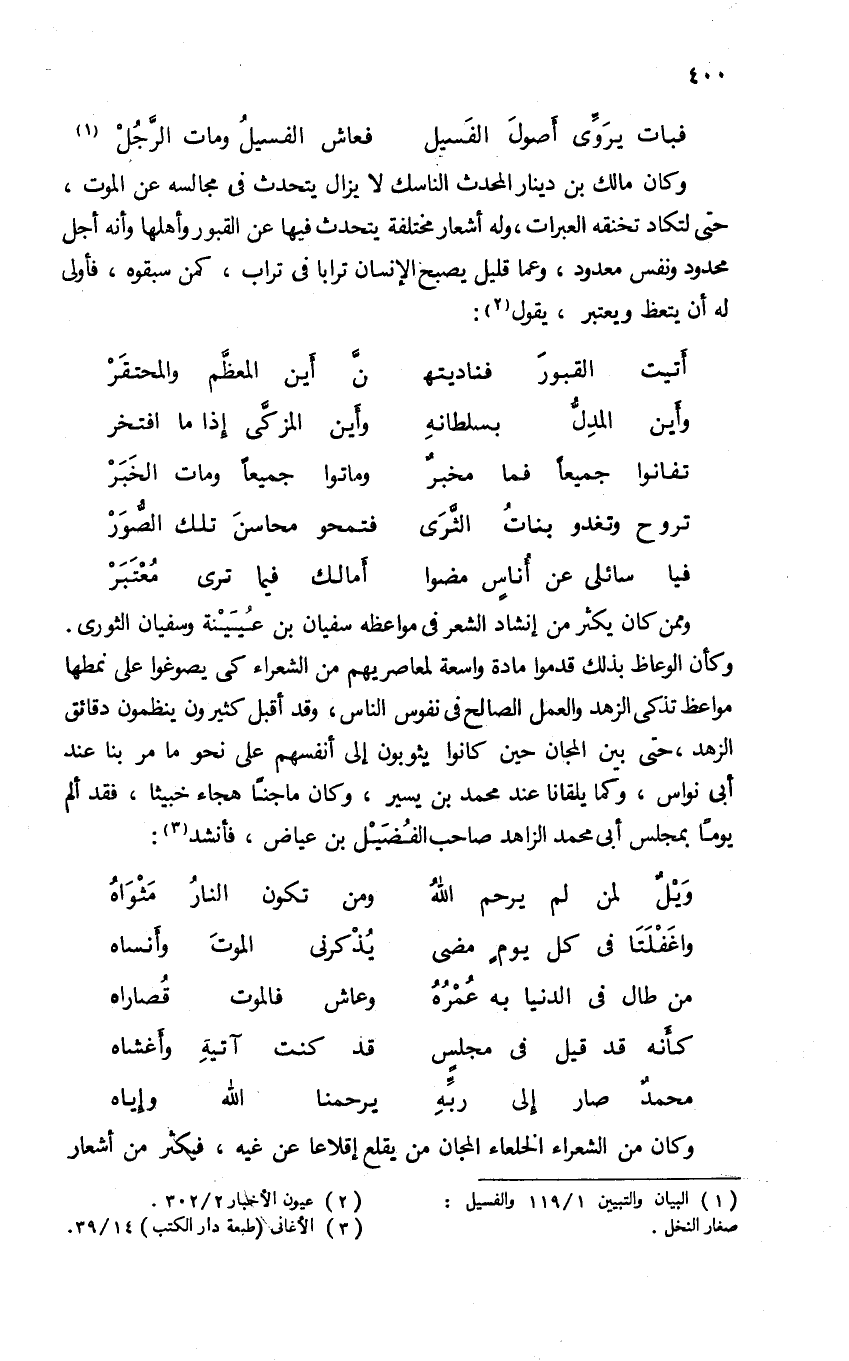وكان مالك بن دينار المحدث الناسك لا يزال يتحدث فى مجالسه عن الموت، حتى لتكاد تخنقه العبرات، وله أشعار مختلفة يتحدث فيها عن القبور وأهلها وأنه أجل محدود ونفس معدود، وعما قليل يصبح الإنسان ترابا فى تراب، كمن سبقوه، فأولى له أن يتعظ ويعتبر، يقول (¬2):