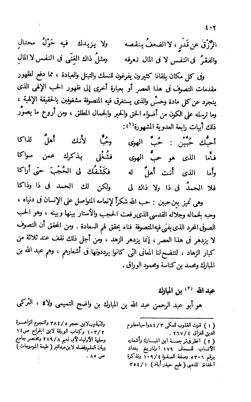 وهى تميز بين حبين: حب الله شكرا لإنعامه المتواصل على الإنسان فى دنياه، وحبه لجماله وجلاله القدسى الذى رفعت الحجب والأستار بينها وبينه، وهو الحب الصوفى المحرد الذى يفنى فيه المتصوفة فناء يحقق لهم السعادة. ومن المحقق أن التصوف لا يزدهر فى هذا العصر، إنما يزدهر الزهد، ومن أجل ذلك نقف عند ثلاثة من كبار الزهاد، لتتضح لنا المعانى التى كانوا يرددونها فى أشعارهم، وهم عبد الله بن المبارك ومحمد بن كناسة ومحمود الوراق.