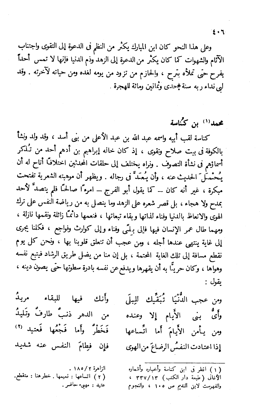 (¬1) انظر فى ابن كناسة وأخباره وأشعاره الأغانى (طبعة دار الكتب) 13/ 337، والفهرست لابن النديم ص 105، والنجوم الزاهرة 2/ 185.