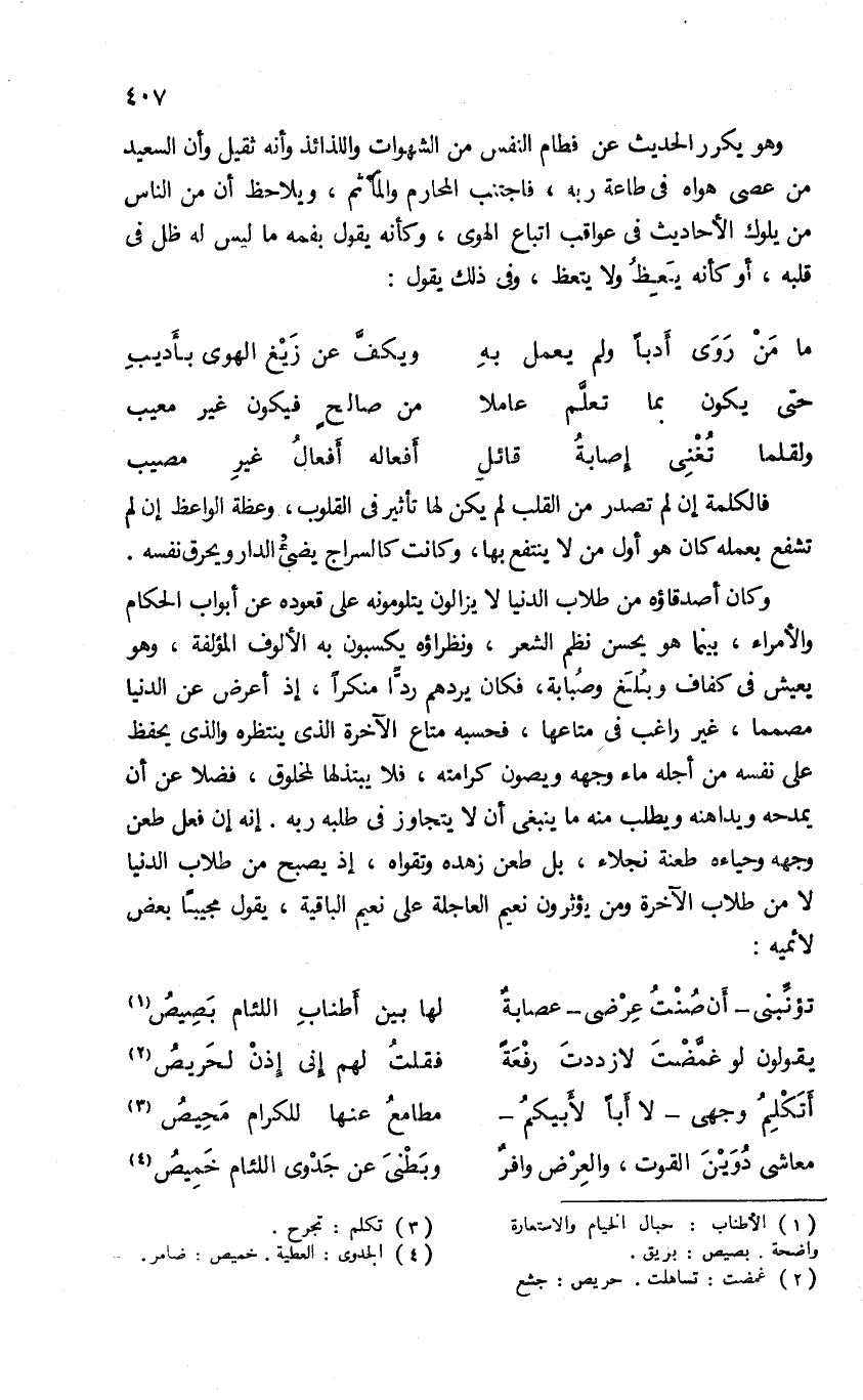 وهو يكرر الحديث عن فطام النفس من الشهوات واللذائذ وأنه ثقيل وأن السعيد من عصى هواه فى طاعة ربه، فاجتنب المحارم والماثم، ويلاحظ أن من الناس من يلوك الأحاديث فى عواقب اتباع الهوى، وكأنه يقول بفمه ما ليس له ظل فى قلبه، أو كأنه يعظ ولا يتعظ، وفى ذلك يقول: