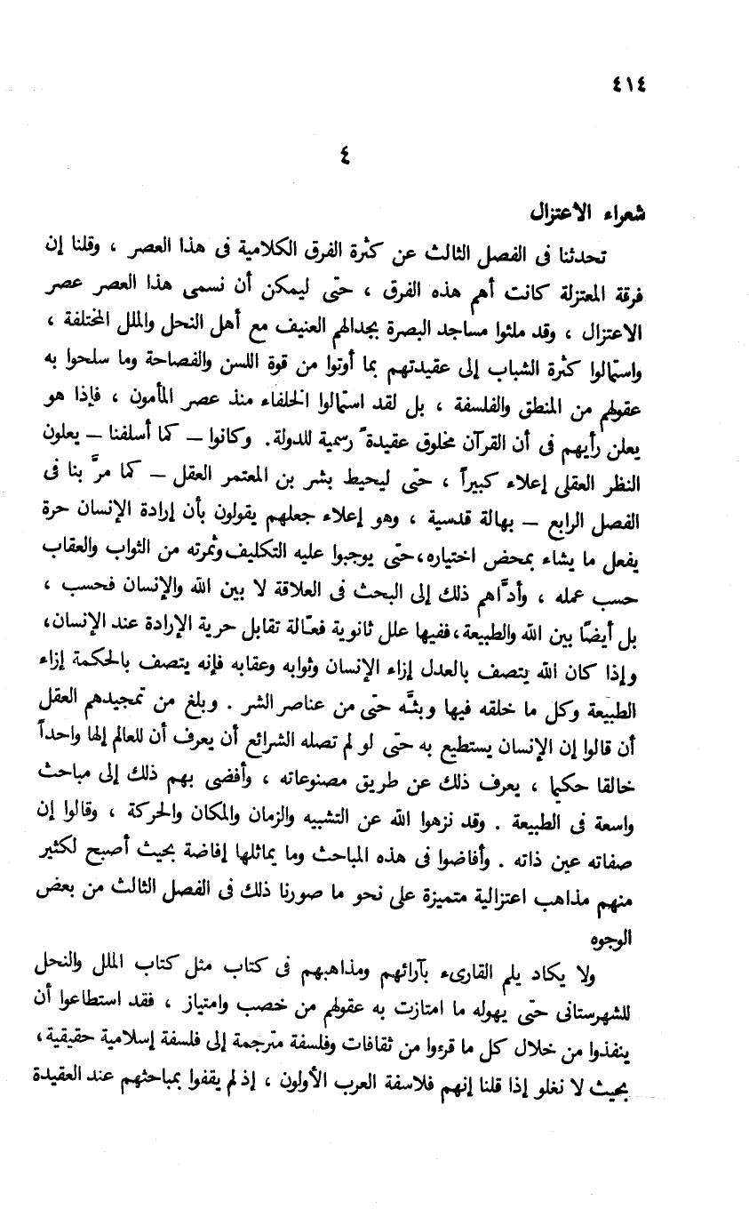 تحدثنا فى الفصل الثالث عن كثرة الفرق الكلامية فى هذا العصر، وقلنا إن فرقة المعتزلة كانت أهم هذه الفرق، حتى ليمكن أن نسمى هذا العصر عصر الاعتزال، وقد ملئوا مساجد البصرة بجدالهم العنيف مع أهل النحل والملل المختلفة، واستمالوا كثرة الشباب إلى عقيدتهم بما أوتوا من قوة اللسن والفصاحة وما سلحوا به عقولهم من المنطق والفلسفة، بل لقد استمالوا الخلفاء منذ عصر المأمون، فإذا هو يعلن رأيهم فى أن القرآن مخلوق عقيدة رسمية للدولة. وكانوا-كما أسلفنا-يعلون النظر العقلى إعلاء كبيرا، حتى ليحيط بشر بن المعتمر العقل-كما مرّ بنا فى الفصل الرابع-بهالة قدسية، وهو إعلاء جعلهم يقولون بأن إرادة الإنسان حرة يفعل ما يشاء بمحض اختياره، حتى يوجبوا عليه التكليف وثمرته من الثواب والعقاب حسب عمله، وأدّاهم ذلك إلى البحث فى العلاقة لا بين الله والإنسان فحسب، بل أيضا بين الله والطبيعة، ففيها علل ثانوية فعّالة تقابل حرية الإرادة عند الإنسان، وإذا كان الله يتصف بالعدل إزاء الإنسان وثوابه وعقابه فإنه يتصف بالحكمة إزاء الطبيعة وكل ما خلقه فيها وبثّه حتى من عناصر الشر. وبلغ من تمجيدهم العقل أن قالوا إن الإنسان يستطيع به حتى لو لم تصله الشرائع أن يعرف أن للعالم إلها واحدا خالقا حكيما، يعرف ذلك عن طريق مصنوعاته، وأفضى بهم ذلك إلى مباحث واسعة فى الطبيعة. وقد نزهوا الله عن التشبيه والزمان والمكان والحركة، وقالوا إن صفاته عين ذاته. وأفاضوا فى هذه المباحث وما يماثلها إفاضة بحيث أصبح لكثير منهم مذاهب اعتزالية متميزة على نحو ما صورنا ذلك فى الفصل الثالث من بعض الوجوه