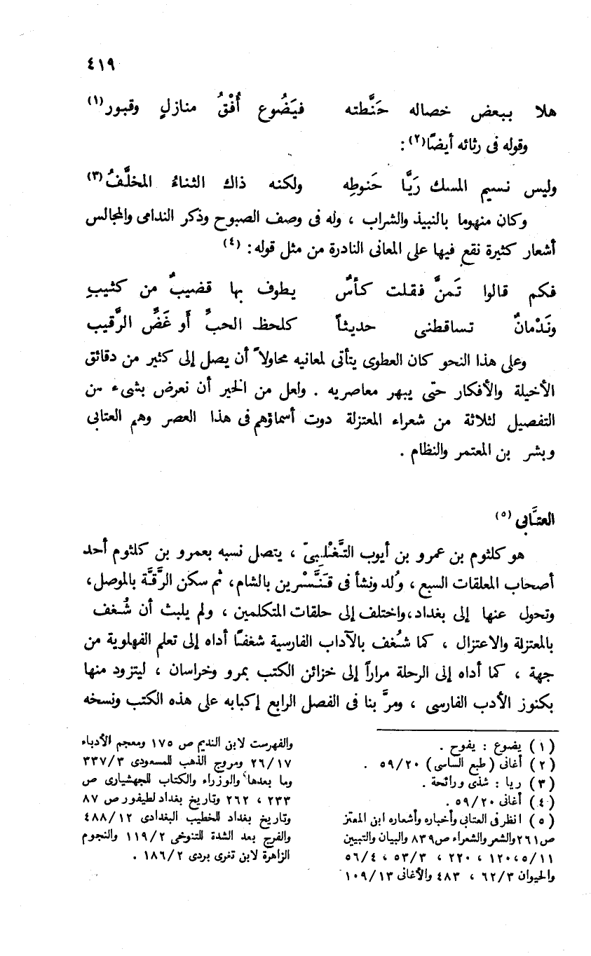 (¬5) انظر فى العتابى وأخباره وأشعاره ابن المعتز ص 261 والشعر والشعراء ص 839 والبيان والتبيين 11/ 5، 120، 220، 3/ 53، 4/ 56 والحيوان 3/ 62، 483 والأغانى 13/ 109 والفهرست لابن النديم ص 175 ومعجم الأدباء 17/ 26 ومروج الذهب للمسعودى 3/ 337 وما بعدها والوزراء والكتاب للجهشيارى ص 233، 262 وتاريخ بغداد لطيفور ص 87 وتاريخ بغداد للخطيب البغدادى 12/ 488 والفرج بعد الشدة للتنوخى 2/ 19 والنجوم الزاهرة لا بن تغرى بردى 2/ 186