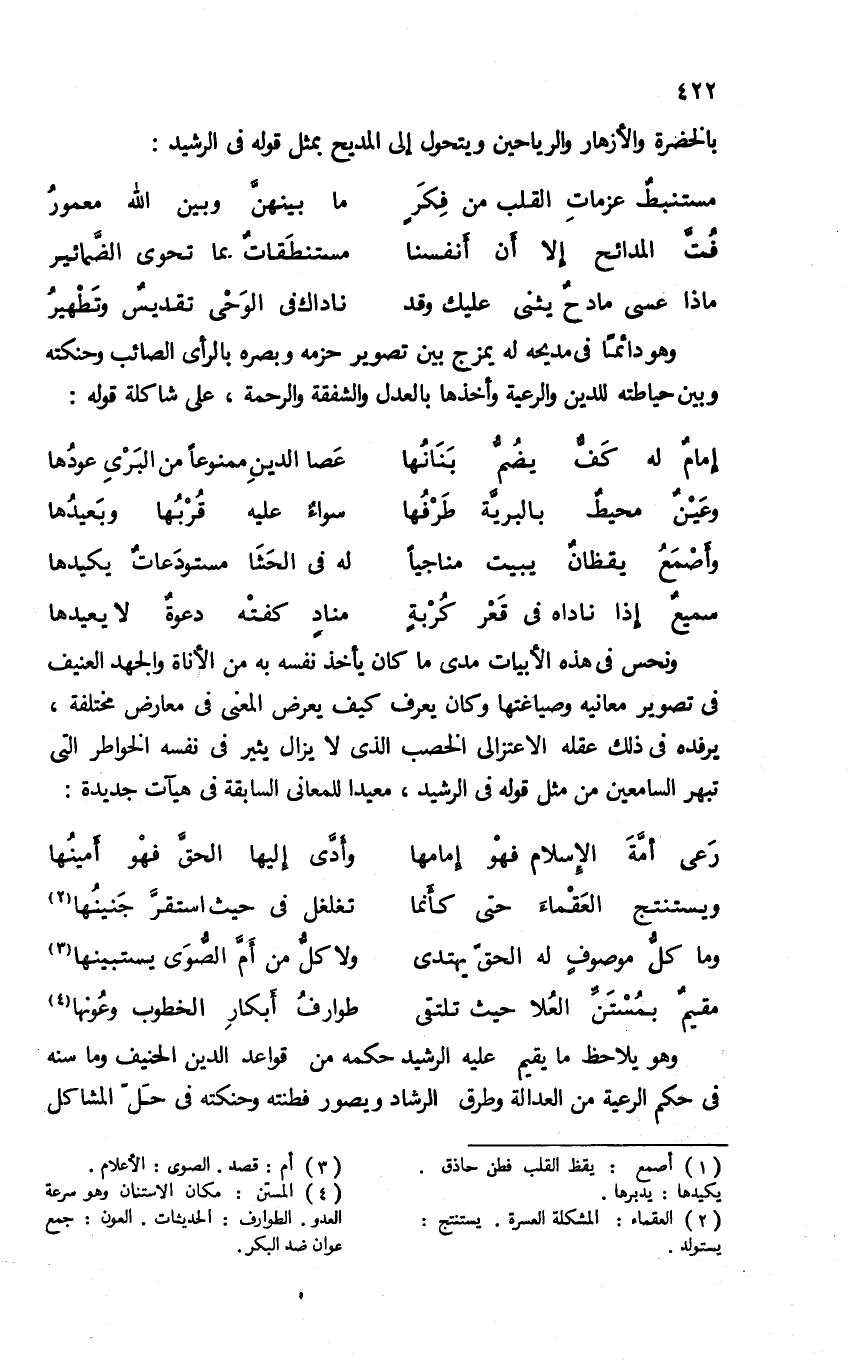 ونحس فى هذه الأبيات مدى ما كان يأخذ نفسه به من الأناة والجهد العنيف فى تصوير معانيه وصياغتها وكان يعرف كيف يعرض المعنى فى معارض مختلفة، يرفده فى ذلك عقله الاعتزالى الخصب الذى لا يزال يثير فى نفسه الخواطر التى تبهر السامعين من مثل قوله فى الرشيد، معيدا للمعانى السابقة فى هيآت جديدة: