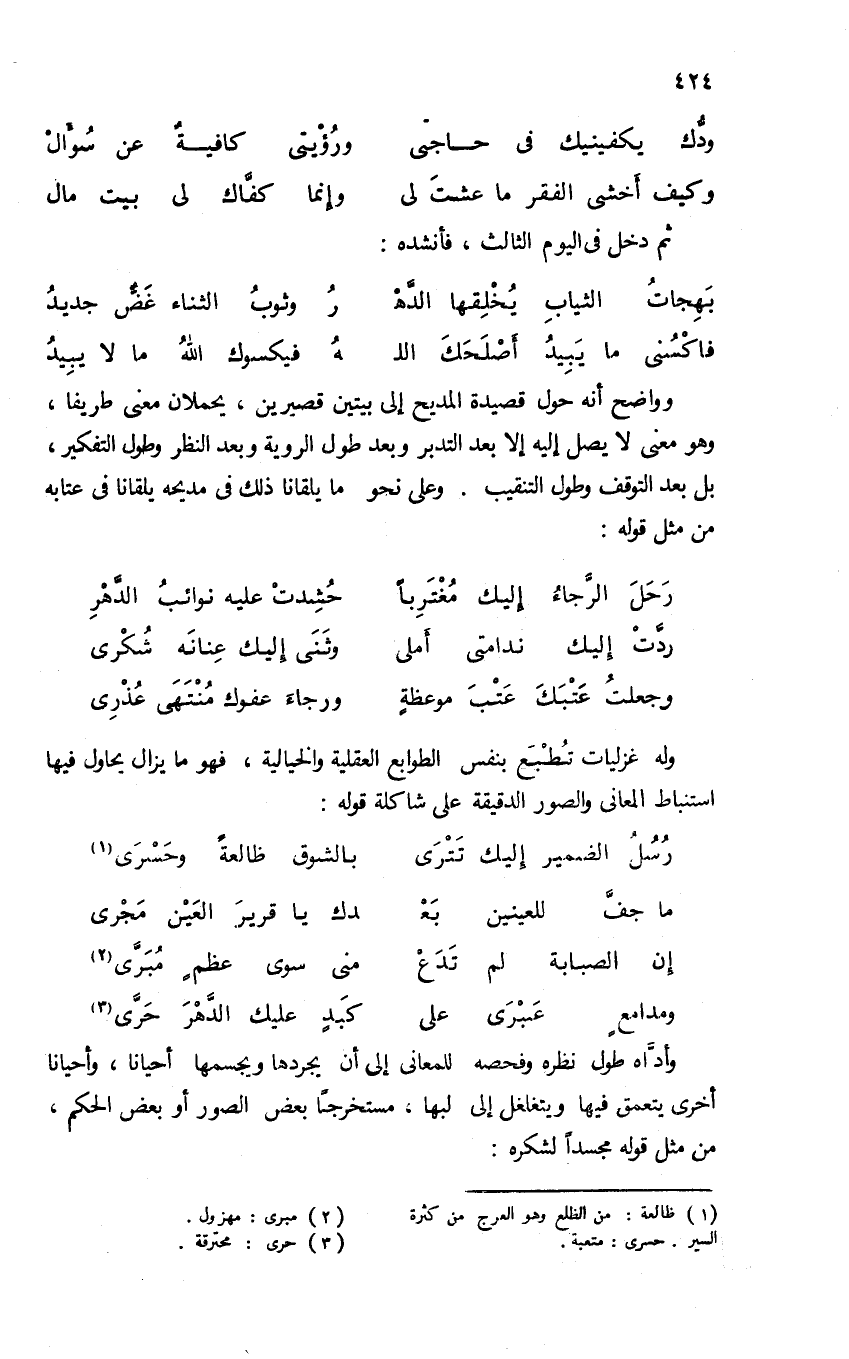 وواضح أنه حول قصيدة المديح إلى بيتين قصيرين، يحملان معنى طريفا، وهو معنى لا يصل إليه إلا بعد التدبر وبعد طول الروية وبعد النظر وطول التفكير، بل بعد التوقف وطول التنقيب. وعلى نحو ما يلقانا ذلك فى مديحه يلقانا فى عتابه من مثل قوله: