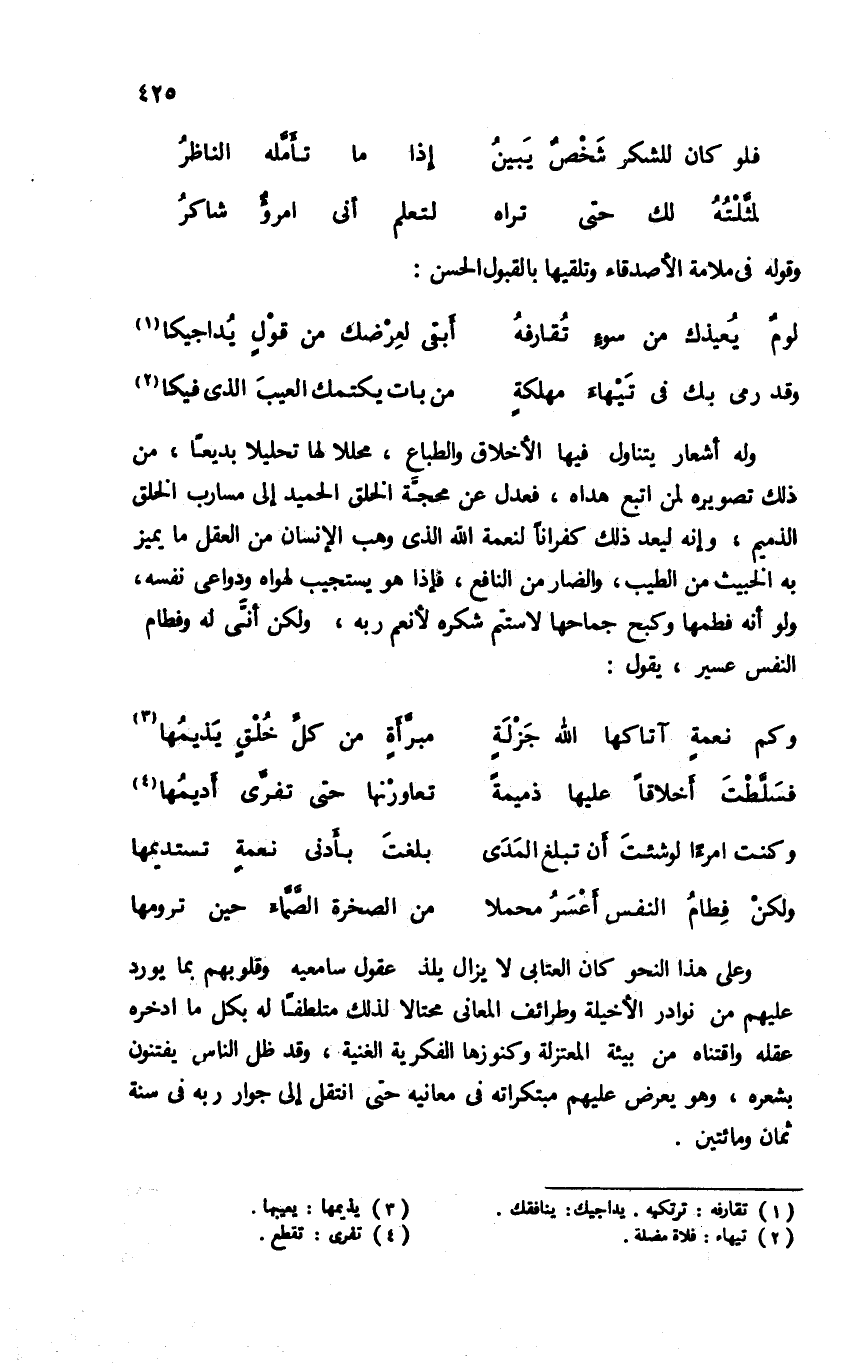 وله أشعار يتناول فيها الأخلاق والطباع، محللا لها تحليلا بديعا، من ذلك تصويره لمن اتبع هداه، فعدل عن محجّة الخلق الحميد إلى مسارب الخلق الذميم، وإنه ليعد ذلك كفرانا لنعمة الله الذى وهب الإنسان من العقل ما يميز به الخبيث من الطيب، والضار من النافع، فإذا هو يستجيب لهواه ودواعى نفسه، ولو أنه فطمها وكبح جماحها لاستتم شكره لأنعم ربه، ولكن أنّى له وفطام النفس عسير، يقول:
