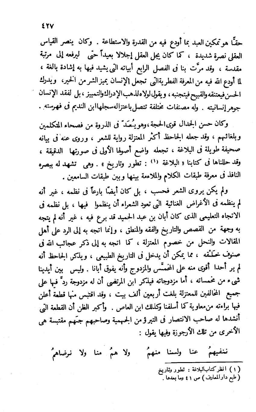 حقّا هو تمكين العبد بما أودع فيه من القدرة والاستطاعة. وكان ينصر القياس العقلى نصرة شديدة، كما كان يجل العقل إجلالا بعيدا حتى ليرفعه إلى مرتبة مقدسة، وقد مرّت بنا فى الفصل الرابع أبياته التى يشيد فيها به إشادة بالغة، لما أودع الله فيه من المعرفة الفطرية التى تجعل الإنسان يميز الشر من الخير، ويدرك الحسن فيعتنقه والقبيح فيتجنبه، ويقول لولاه لذهب الإدراك والتمييز، بل لفقد الإنسان جوهر إنسانيته. وله مصنفات مختلفة تتصل باعتزاله سجلها ابن النديم فى فهرسته.