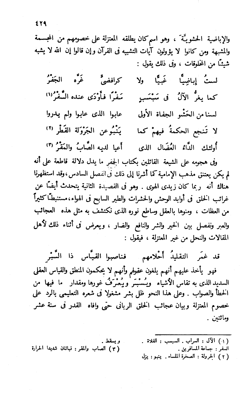 وفى هجومه على الشيعة القائلين بكتاب الجفر ما يدل دلالة قاطعة على أنه لم يكن يعتنق مذهب الإمامية كما أشرنا إلى ذلك فى الفصل السادس، وقد استظهرنا هناك أنه ربما كان زيدى الهوى. وهو فى القصيدة الثانية يتحدث أيضا عن غرائب الخلق فى أوابد الوحش والحشرات والطير السابح فى الهواء، مستنبطا كثيرا من العظات، ومنوها بالعقل وساطع نوره الذى نكتشف به مثل هذه العجائب والعبر ونفصل بين الخير والشر والنافع والضار، ويعرض فى أثناء ذلك لأهل المقالات والنحل من غير المعتزلة، فيقول: