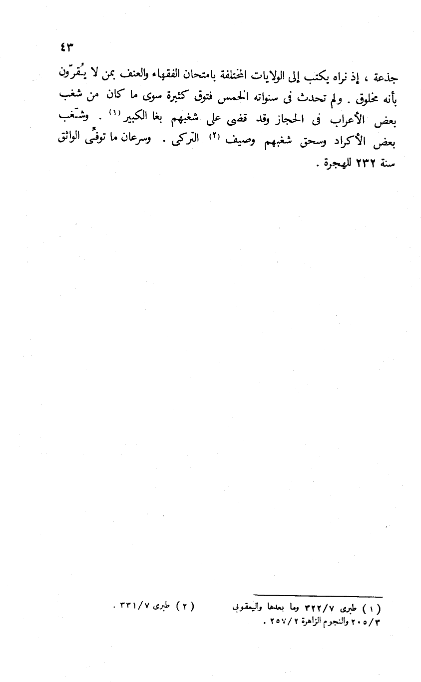 جذعة، إذ نراه يكتب إلى الولايات المختلفة بامتحان الفقهاء والعنف بمن لا يقرّون بأنه مخلوق. ولم تحدث فى سنواته الخمس فتوق كثيرة سوى ما كان من شغب بعض. الأعراب فى الحجاز وقد قضى على شغبهم بغا الكبير (¬1). وشغب بعض الأكراد وسحق شغبهم وصيف (¬2) التركى. وسرعان ما توفّى الواثق سنة 232 للهجرة.