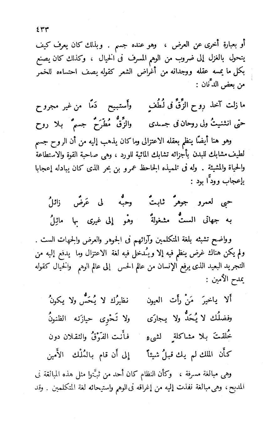 وهو هنا أيضا ينظم بعقله الاعتزالى وما كان يذهب إليه من أن الروح جسم لطيف مشابك للبدن بأجزائه تشابك المائية للورد، وهى صاحبة القوة والاستطاعة والحياة والمشيئة. وله فى تلميذه الجاحظ عمرو بن بحر الذى كان يبادله إعجابا بإعجاب وودّا بود: