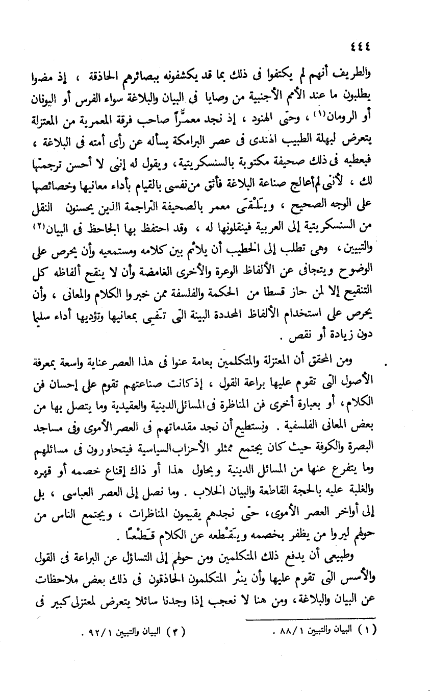 ومن المحقق أن المعتزلة والمتكلمين بعامة عنوا فى هذا العصر عناية واسعة بمعرفة الأصول التى تقوم عليها براعة القول، إذ كانت صناعتهم تقوم على إحسان فن الكلام، أو بعبارة أخرى فن المناظرة فى المسائل الدينية والعقيدية وما يتصل بها من بعض المعانى الفلسفية. ونستطيع أن نجد مقدماتهم فى العصر الأموى وفى مساجد البصرة والكوفة حيث كان يجتمع ممثلو الأحزاب السياسية فيتحاورون فى مسائلهم وما يتفرع عنها من المسائل الدينية ويحاول هذا أو ذاك إقناع خصمه أو قهره والغلبة عليه بالحجة القاطعة والبيان الخلاب. وما نصل إلى العصر العباسى، بل إلى أواخر العصر الأموى، حتى نجدهم يقيمون المناظرات، ويجتمع الناس من حولهم ليروا من يظفر بخصمه ويقطعه عن الكلام قطعا.