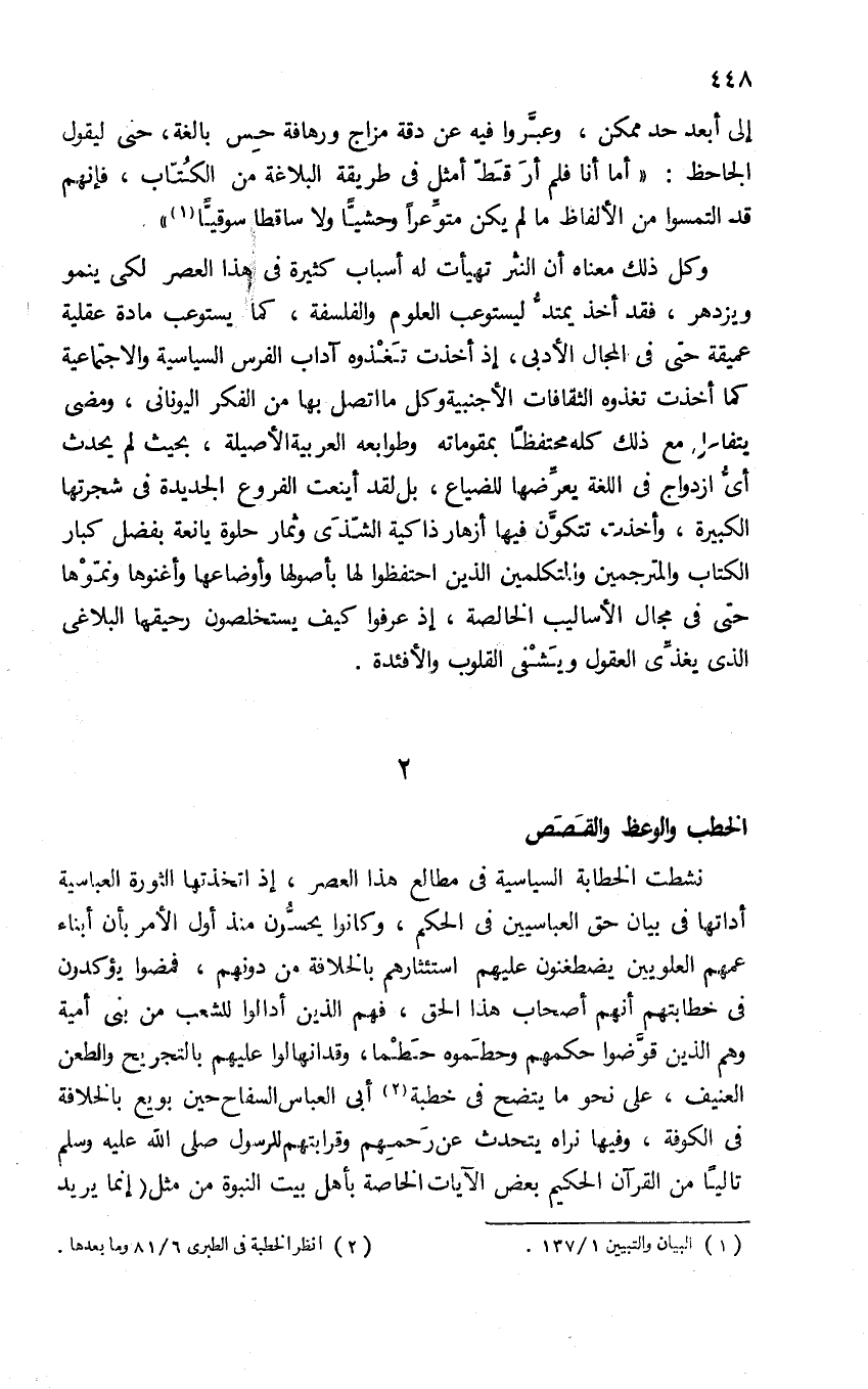 وكل ذلك معناه أن النثر تهيأت له أسباب كثيرة فى هذا العصر لكى ينمو ويزدهر، فقد أخذ يمتدّ ليستوعب العلوم والفلسفة، كما يستوعب مادة عقلية عميقة حتى فى المجال الأدبى، إذ أخذت تغذوه آداب الفرس السياسية والاجتماعية كما أخذت تغذوه الثقافات الأجنبية وكل ما اتصل بها من الفكر اليونانى، ومضى يتفاسرا مع ذلك كله محتفظا بمقوماته وطوابعه العربية الأصيلة، بحيث لم يحدث أىّ ازدواج فى اللغة يعرّضها للضياع، بل لقد أينعت الفروع الجديدة فى شجرتها الكبيرة، وأخذت تتكوّن فيها أزهار ذاكية الشّذى وثمار حلوة يانعة بفضل كبار الكتاب والمترجمين والمتكلمين الذين احتفظوا لها بأصولها وأوضاعها وأغنوها ونمّوها حتى فى مجال الأساليب الخالصة، إذ عرفوا كيف يستخلصون رحيقها البلاغى الذى يغذّى العقول ويشفى القلوب والأفئدة.