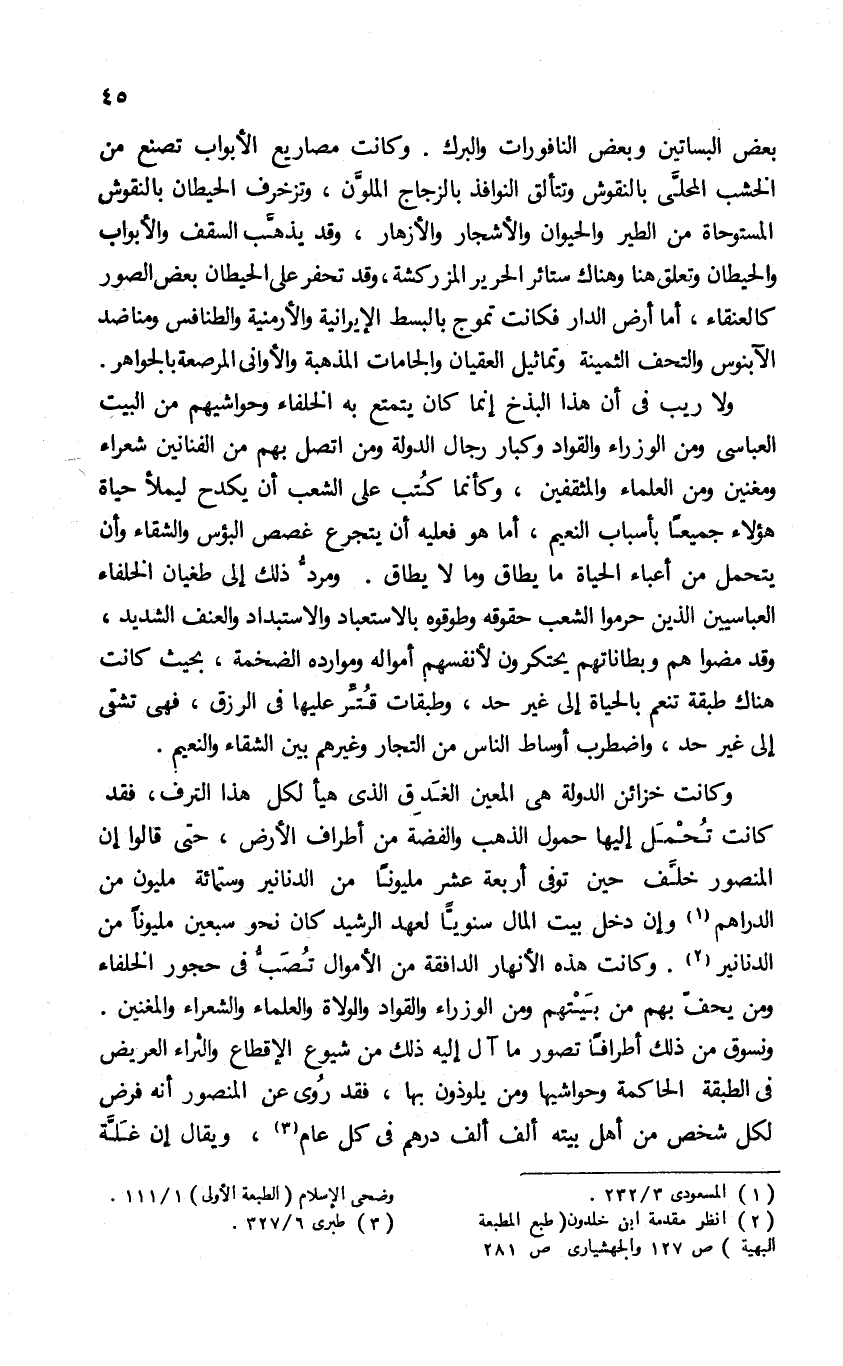 ولا ريب فى أن هذا البذخ إنما كان يتمتع به الخلفاء وحواشيهم من البيت العباسى ومن الوزراء والقواد وكبار رجال الدولة ومن اتصل بهم من الفنانين شعراء ومغنين ومن العلماء والمثقفين، وكأنما كتب على الشعب أن يكدح ليملأ حياة هؤلاء جميعا بأسباب النعيم، أما هو فعليه أن يتجرع غصص البؤس والشقاء وأن يتحمل من أعباء الحياة ما يطاق وما لا يطاق. ومردّ ذلك إلى طغيان الخلفاء العباسيين الذين حرموا الشعب حقوقه وطوقوه بالاستعباد والاستبداد والعنف الشديد، وقد مضوا هم وبطاناتهم يحتكرون لأنفسهم أمواله وموارده الضخمة، بحيث كانت هناك طبقة تنعم بالحياة إلى غير حد، وطبقات قتّر عليها فى الرزق، فهى تشقى إلى غير حد، واضطرب أوساط الناس من التجار وغيرهم بين الشقاء والنعيم.