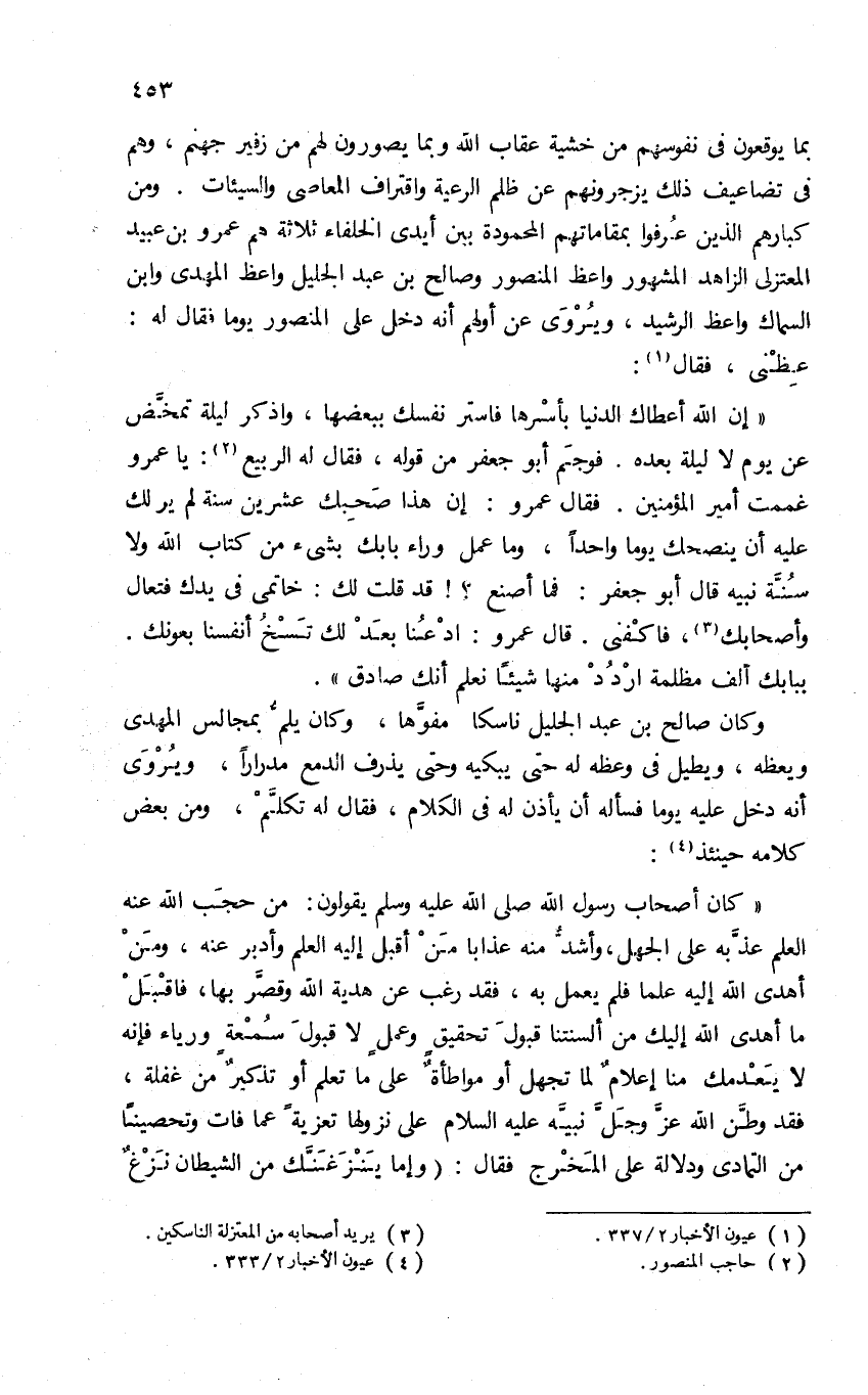 «إن الله أعطاك الدنيا بأسرها فاستر نفسك ببعضها، واذكر ليلة تمخّض عن يوم لا ليلة بعده. فوجم أبو جعفر من قوله، فقال له الربيع (¬2): يا عمرو غممت أمير المؤمنين. فقال عمرو: إن هذا صحبك عشرين سنة لم ير لك عليه أن ينصحك يوما واحدا، وما عمل وراء بابك بشئ من كتاب الله ولا سنّة نبيه قال أبو جعفر: فما أصنع؟ ! قد قلت لك: خاتمى فى يدك فتعال وأصحابك (¬3)، فاكفنى. قال عمرو: ادعنا بعد لك تسخ أنفسنا بعونك.